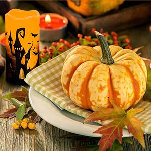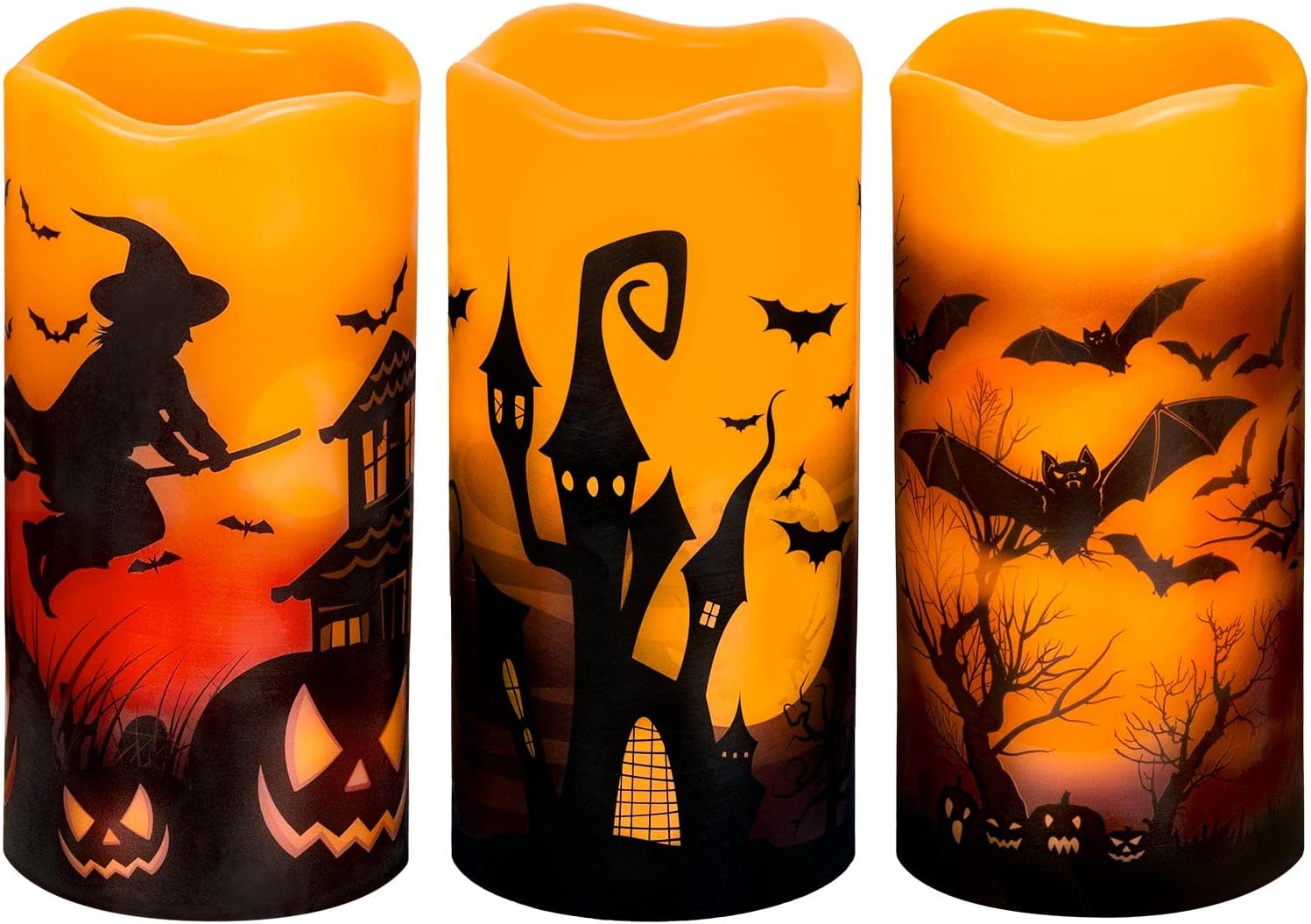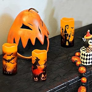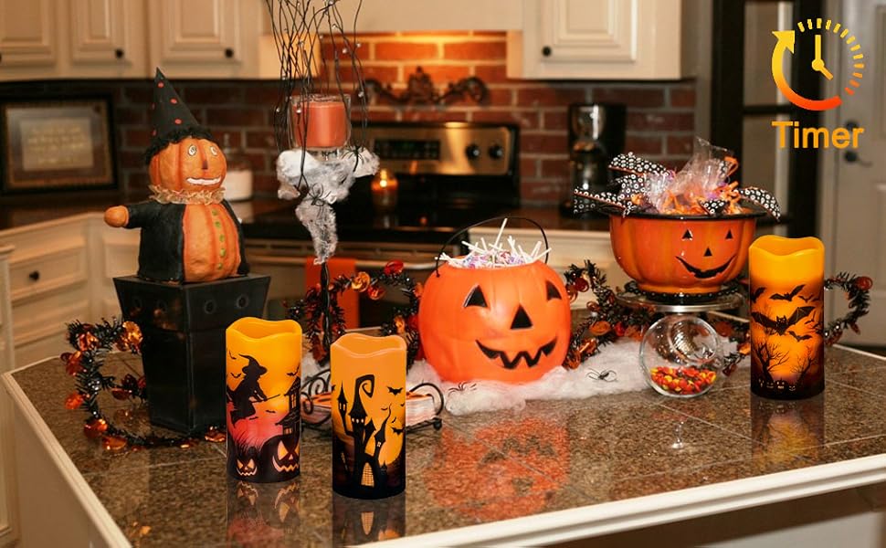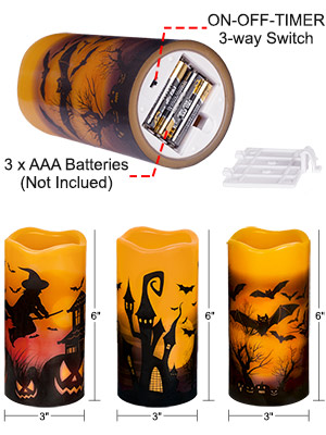 【BATTERY OPERATED HALLOWEEN CANDLES】Each led Halloween pillar candle requires 3 PCS AAA batteries(NOT INCLUDED). The battery operated timer candles is safe for halloween fireplace decor, large pumpkin light, jack-o-lantern, thanksgiving holiday decorations.