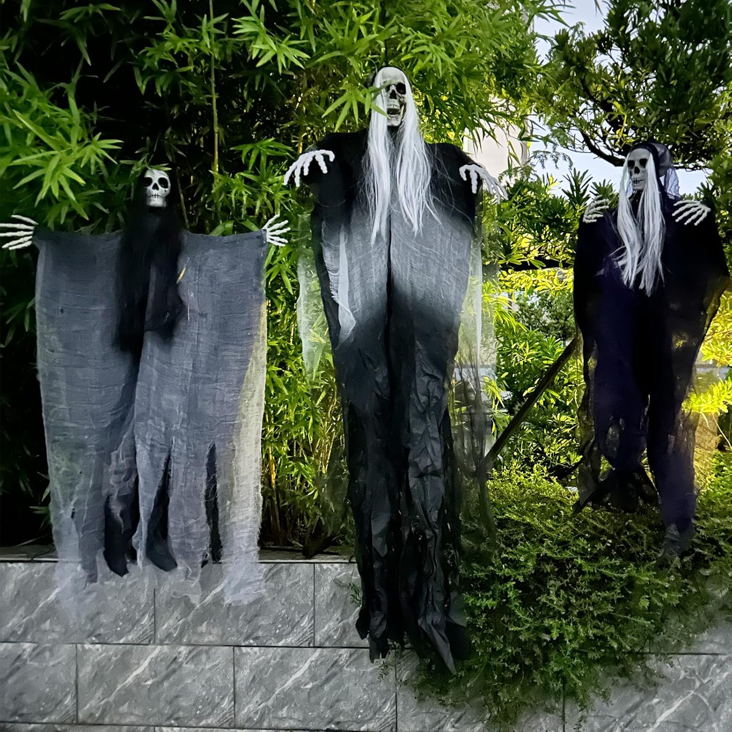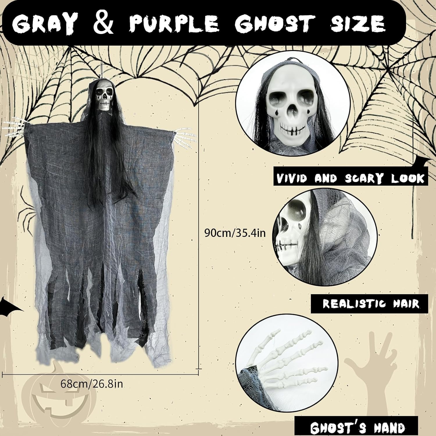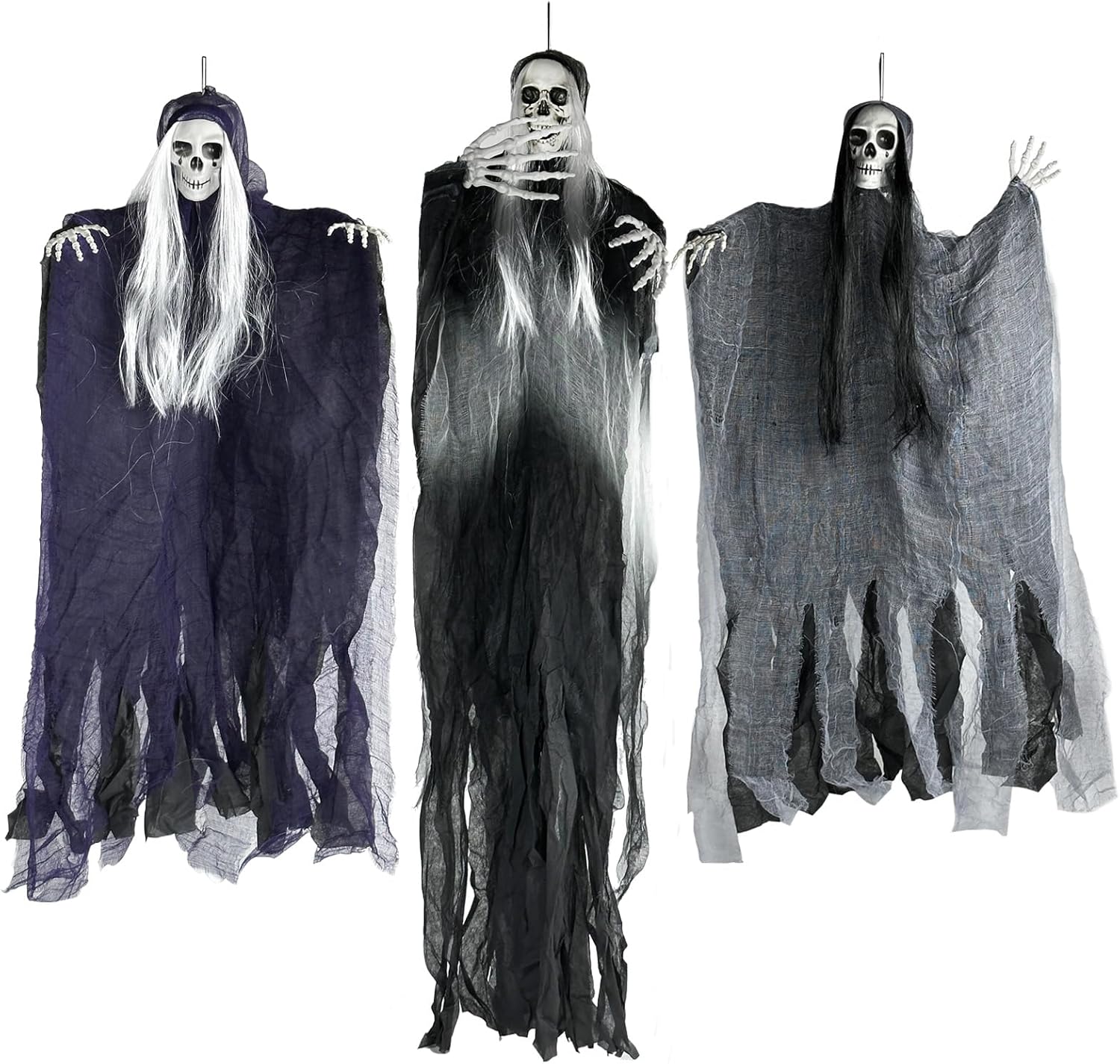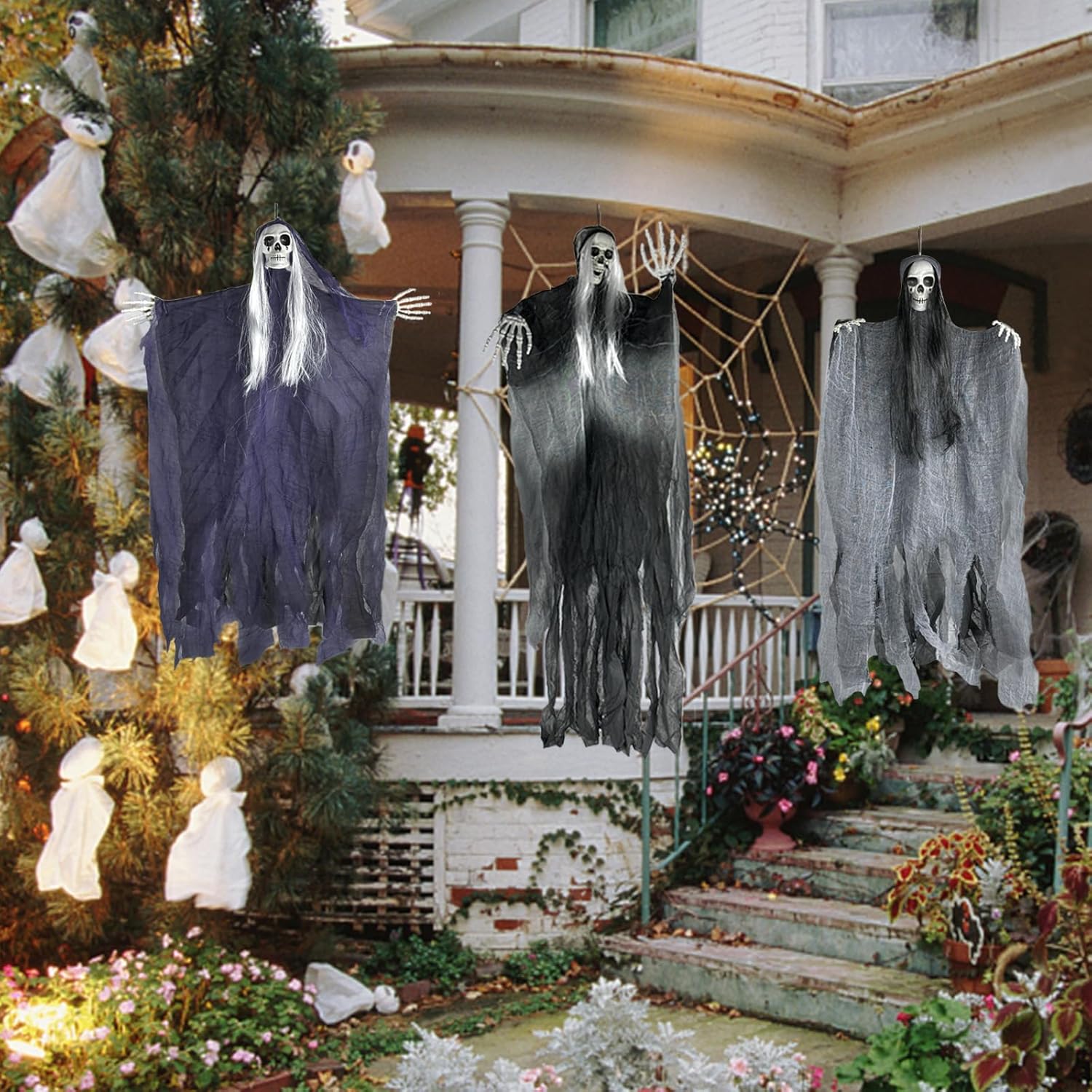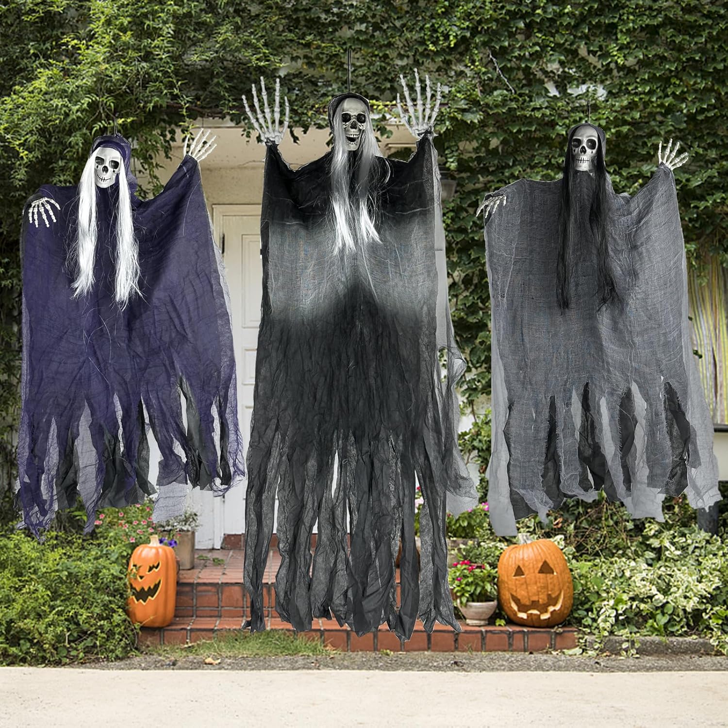 【Halloween Outdoor Decorations】3 Halloween hanging ghosts,you will receive three different styles of hangable horror skeleton grim reaper hanging ghost decorations. Among them,the largest hanging ghost is 125 cm,and the purple and gray hanging halloween skeleton ghosts are 95cm.Different costumes and sizes to create a creepy horror atmosphere for any Halloween event