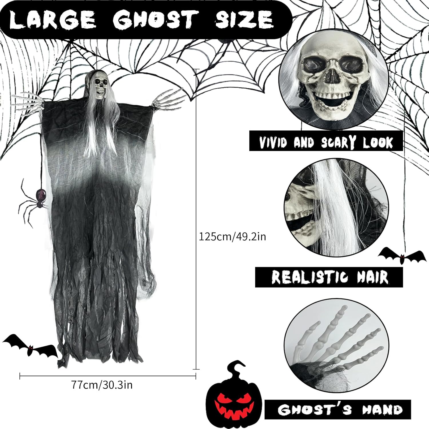 【Scary Halloween Decorations】The halloween hanging skeleton ghost reveals a creepy skull,scary hands covered with messy white hair and wearing a flowing robe,which, looks very scary and will send chills down your guests spines adding a spooky atmosphere on halloween,giving you and your friends a different halloween experience.