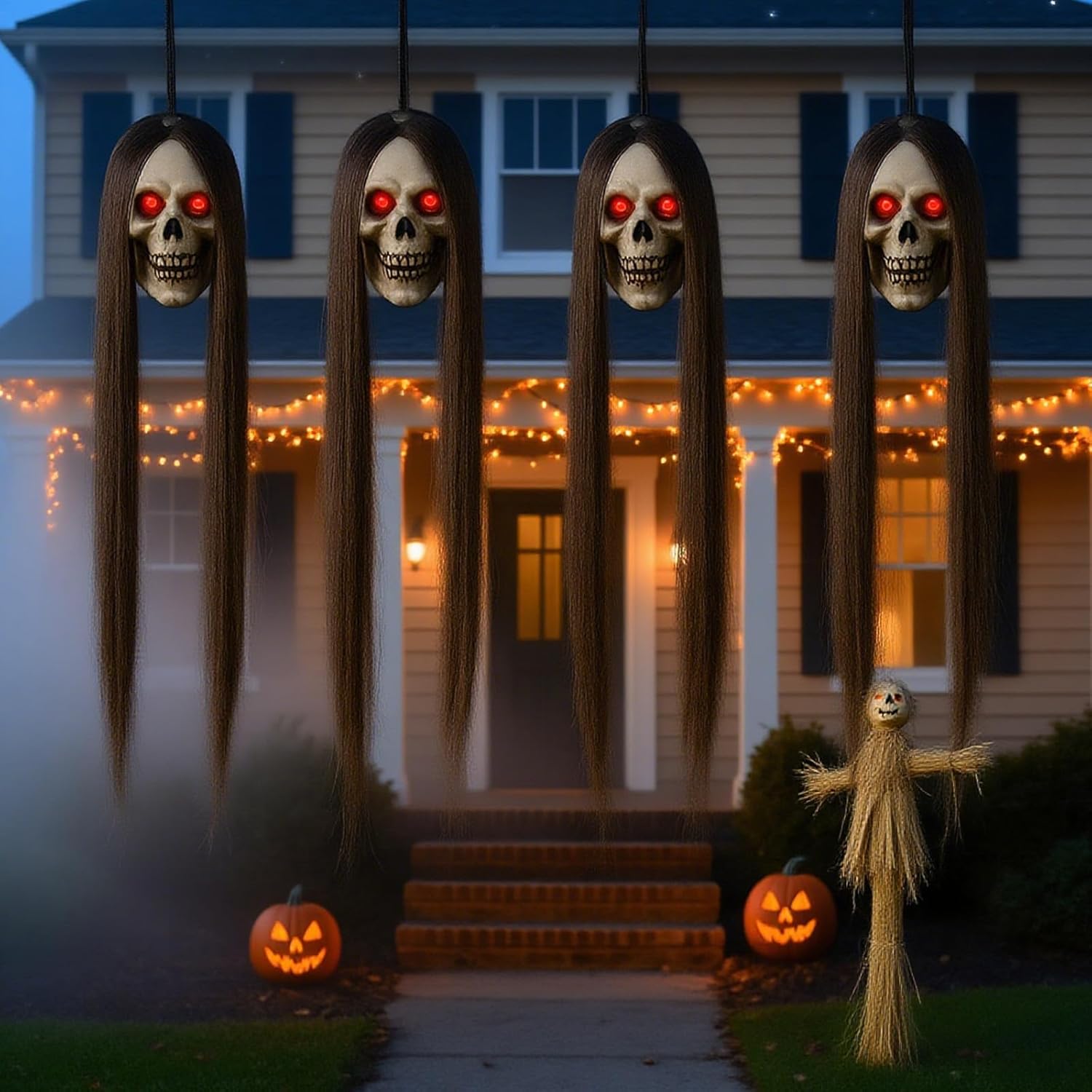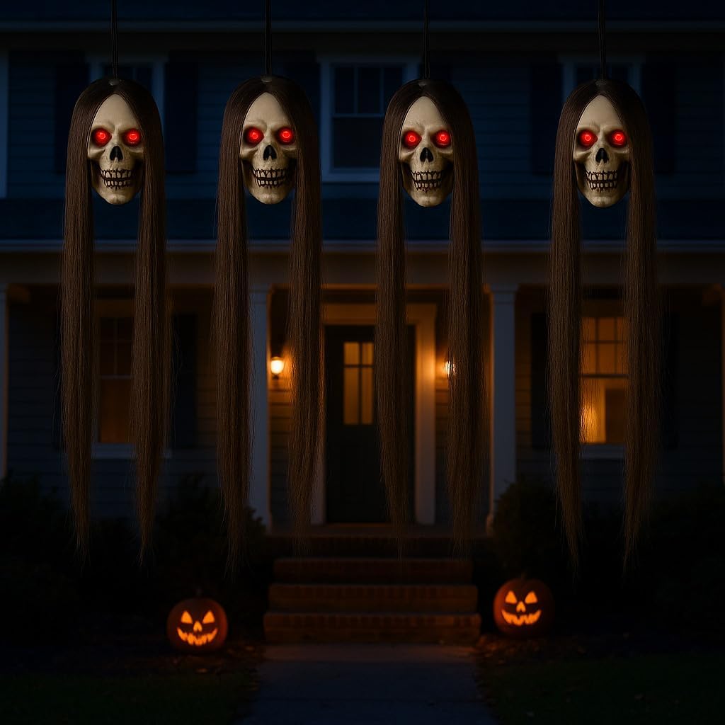 4 Pack Halloween Outdoor Decorations, Hanging Eyes Emit Light Long-Haired Skeleton Decor Supplies, Haunted Creepy House Halloween Flying Decorations with Yard Tree Porch Garden Party Indoor Décor