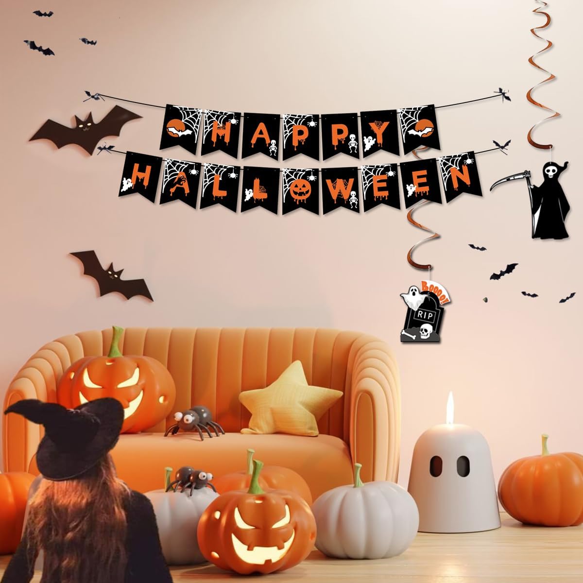 AMLOOPH Halloween Decorations Reusable Indoor Set – Happy Halloween Banner, Hanging Pumpkin, Bat, Ghosts Bunting Garland, Trick or Treat Sign and Spooky Hanging for Party Decorations