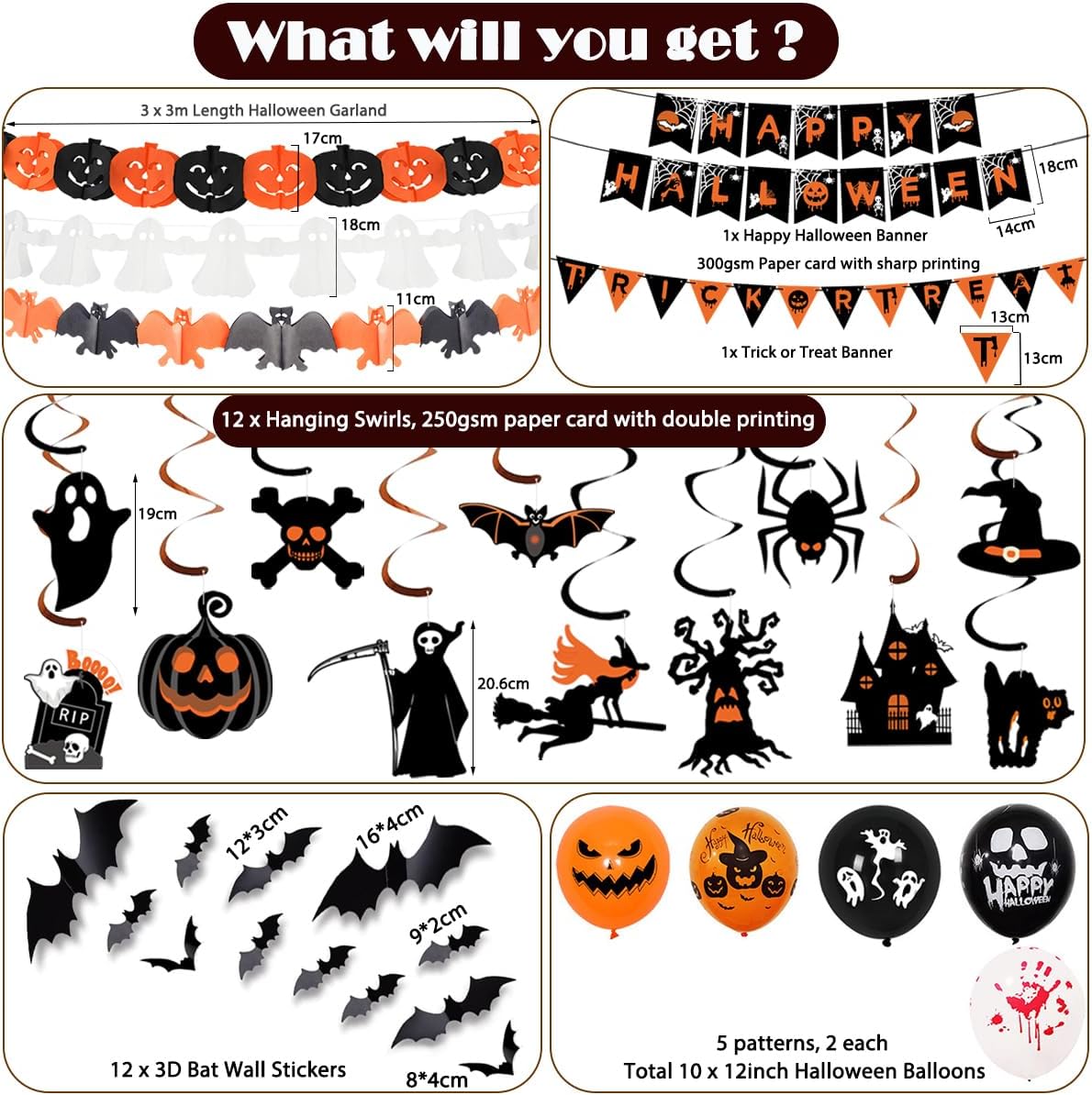 Halloween Decorations Pack Inclueds — 1 x happy halloween banner, 1x trick or treat banner, 3x halloween garlands (bats, pumpkins and ghosts), 12x halloween hanging decorations with spooky figures, 12 x 3d halloween bat decorations wall stickers, 1 x ribbons, 10 x halloween balloons. Perfect halloween decorations indoor kit at a great value! This hanging halloween decorations pack will spook and delight all your party guests.