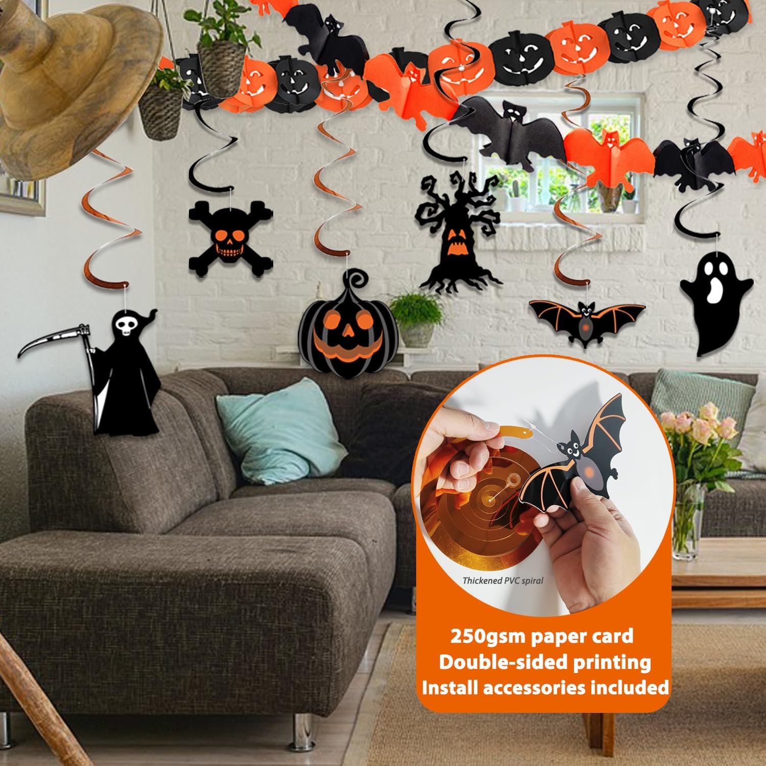 Reusable Indoor Halloween Decorations Set — Our Halloween Party Decoration set is made from recyclable paper and includes a variety of stunning, reusable decorations. Perfect for any home, this comprehensive set meets all your party needs for a spooky, memorable atmosphere.