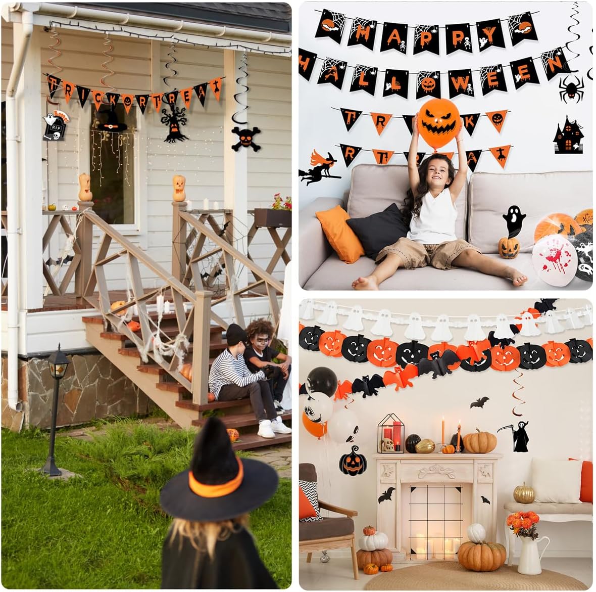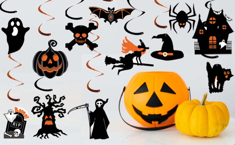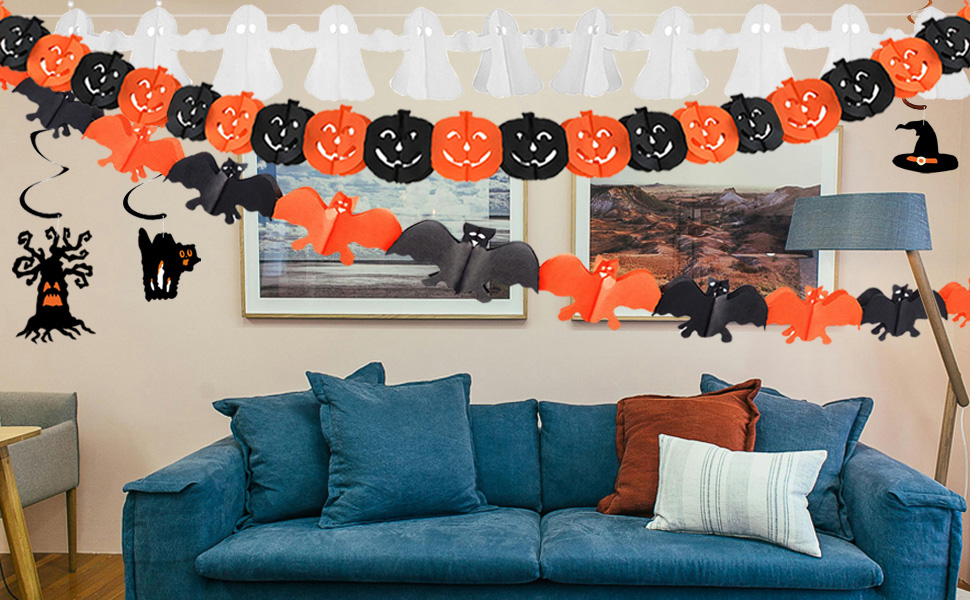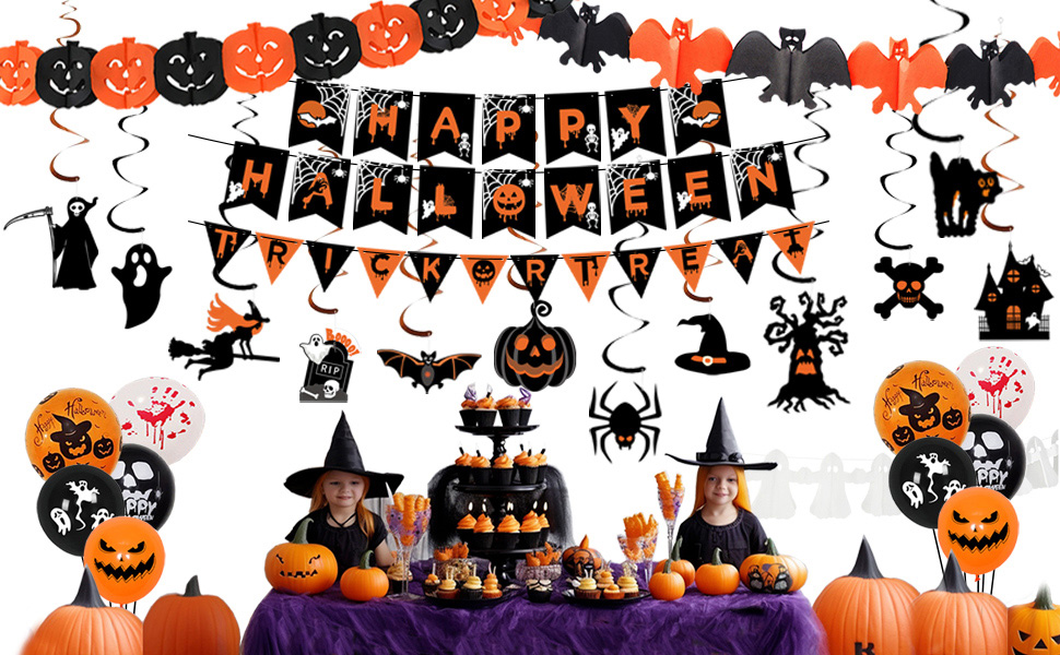 Creative and Popular Halloween Indoor Decorations — Our kit includes uniquely designed happy halloween banner, halloween bunting, halloween hanging swirls, halloween pumpkin decorations featuring both scary and cute themes. this set also contains halloween bats, pumpkins, ghosts, balloons, and trick or treat sign decorations, perfect for parties, trick or treat events, haunted houses, playrooms, schools or office decorations.