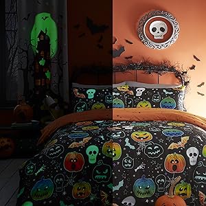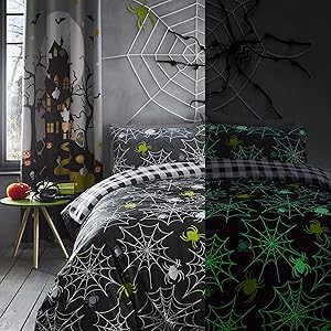 Tricks and treats are what we bring with the Bedlam glow in the dark duvet cover sets. Featuring spiders, ghosts, pumpkins, skeletons and mummies offering a theme or style for every little monster.