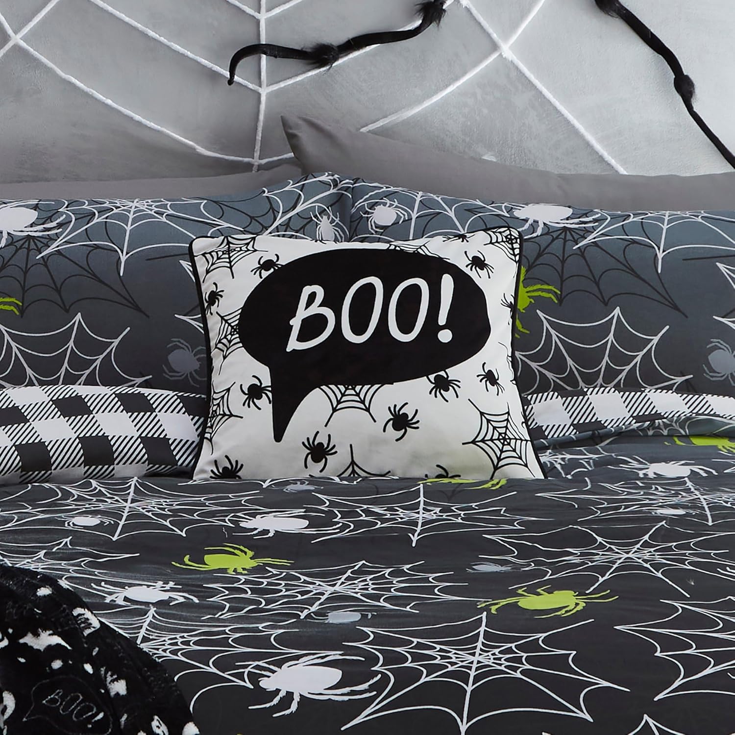 Unleash spooky vibes with the Bedlam Glow In the Dark Duvet Cover Set – Spiders this Halloween! Watch as glowing spiders and webs create a spine-chilling effect against the black background. Flip the cover to reveal a striking black and white checkered design. Elevate your Halloween decor and transform your space into a hauntingly stylish retreat with this one-of-a-kind bedding set!