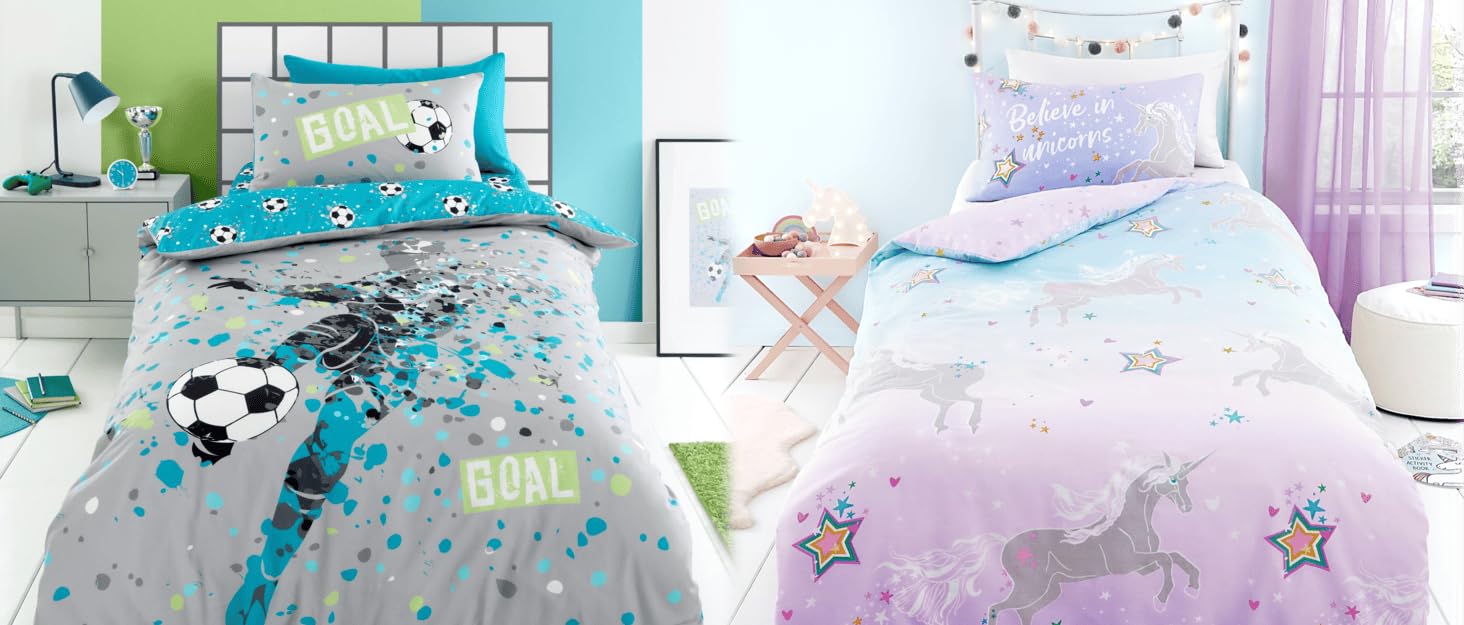From football and video games to unicorns, sea animals, outer space, florals, and dinosaur – we’ve got vibrant bedding sets, plus matching cushions, curtains, throws, and ponchos. Let every corner spark joy and imagination.