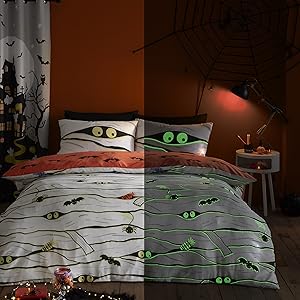 Tricks and treats are what we bring with the Bedlam glow in the dark duvet cover sets. Featuring spiders, ghosts, pumpkins, skeletons and mummies offering a theme or style for every little monster.