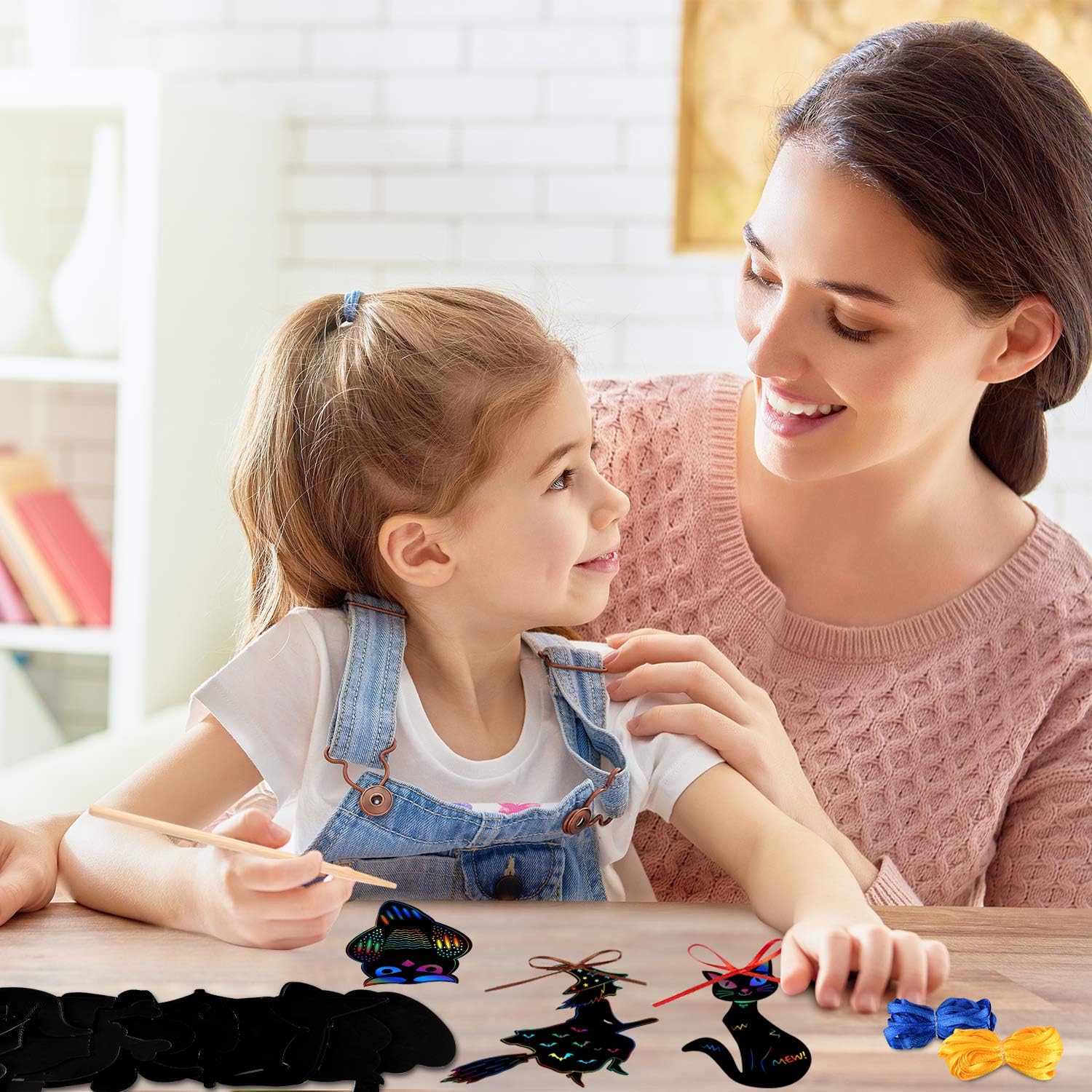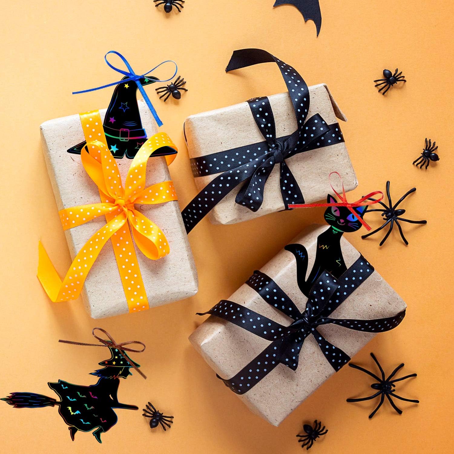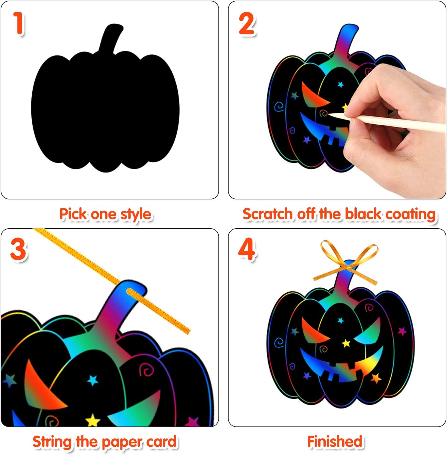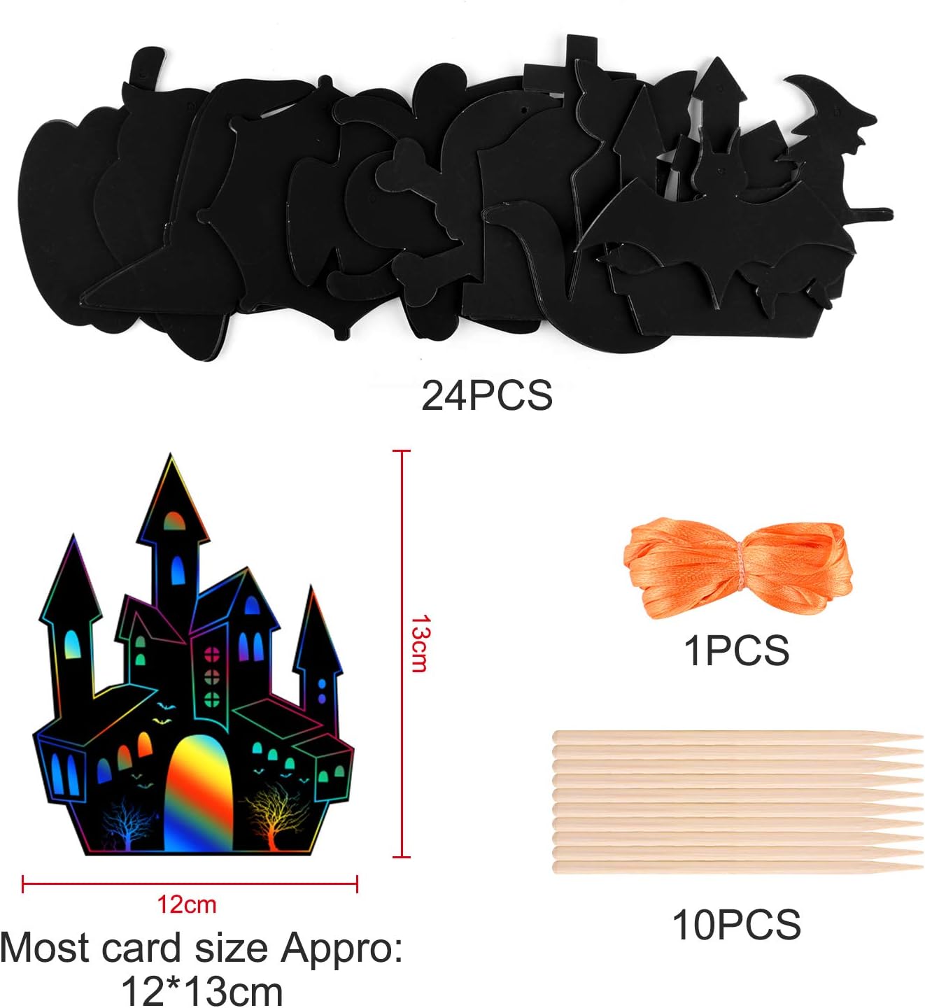 Package: 24 pieces Halloween theme scratch paper in 12 different styles, 8m ribbon and 10 bamboo pens, enough to meet your needs.