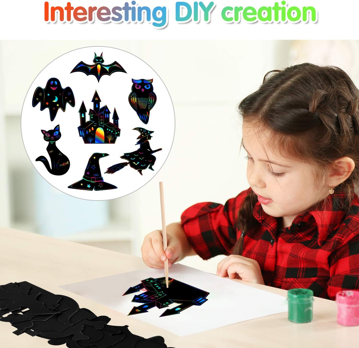 Easy to use and master: Scratch off the black area, then the colorful layer will appear. You can DIY your own scratch paper and draw your favorite words, patterns and figures on it.