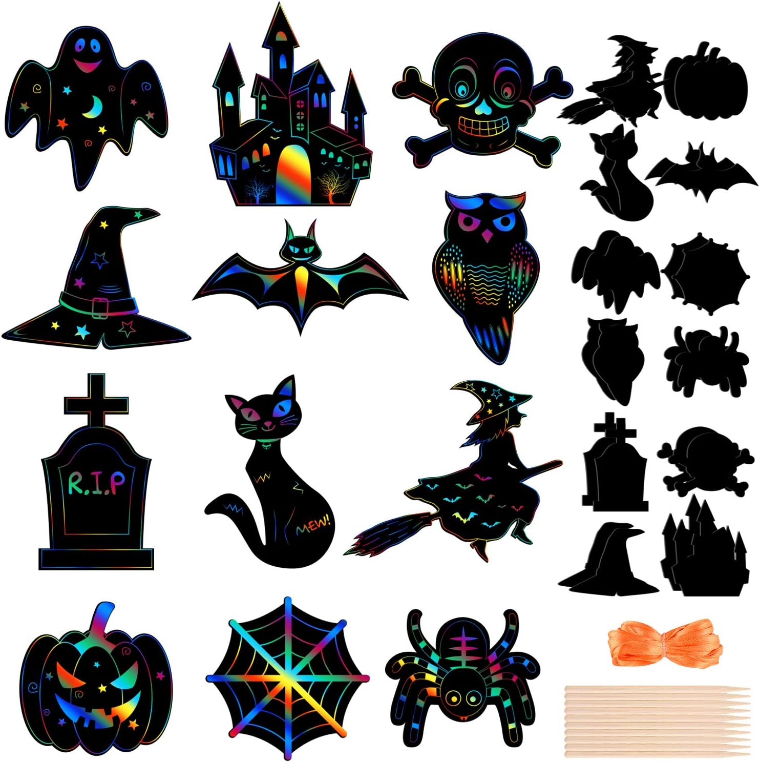 CHRORINE 24Pcs Halloween Theme Scratch Paper Kit 12 Styles Scratch Art Paper Pumpkin Bat Craft for Halloween Party Supplies