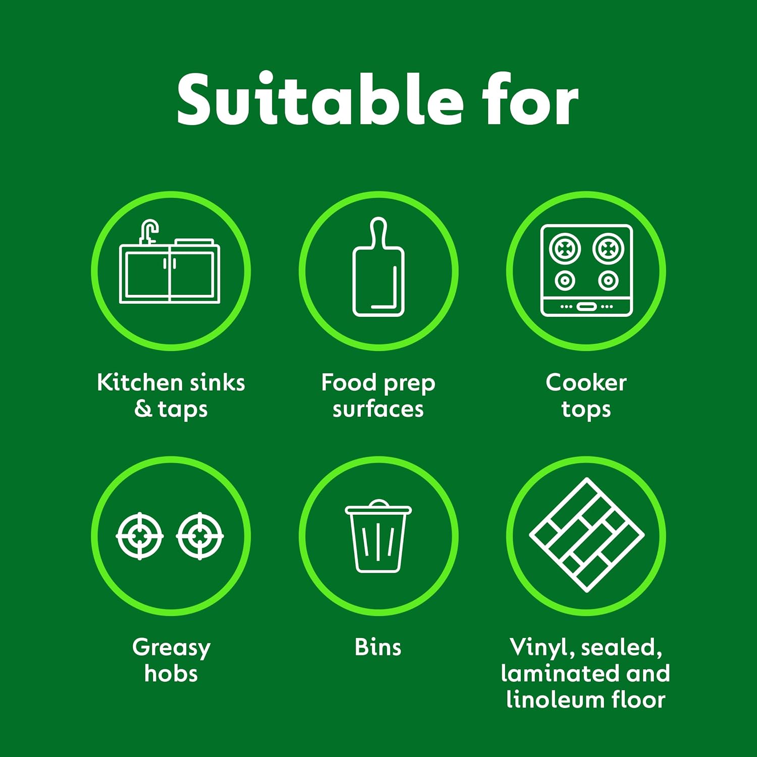 SUITABLE FOR: kitchen and bathroom sinks & taps, kitchen work surfaces, cooker tops, sealed wood surfaces, glass surfaces, draining boards, greasy hobs, bins, vinyl and sealed laminated floors and linoleum