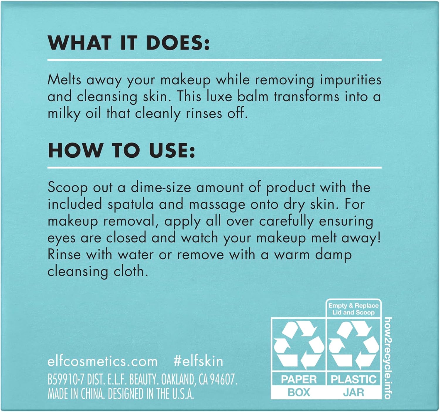 What it is: Watch your makeup melt away with e.l.f. Holy Hydration! Makeup Melting Cleansing Balm! It’s solid balm form melts into a luxurious oil and turns into a nourishing milk texture that rinses off clean. Formulated with hyaluronic acid, ceramides and peptides leaving your skin feeling silky smooth and plumped with hydration. Why e.l.f. loves: § Cleansing balm easily removes makeup without stripping the skin. Formulated with hyaluronic acid, ceramides and peptides leaving skin feeling plumped with hydration & Leaves skin feeling silky smooth and hydrated § Great for all skin types