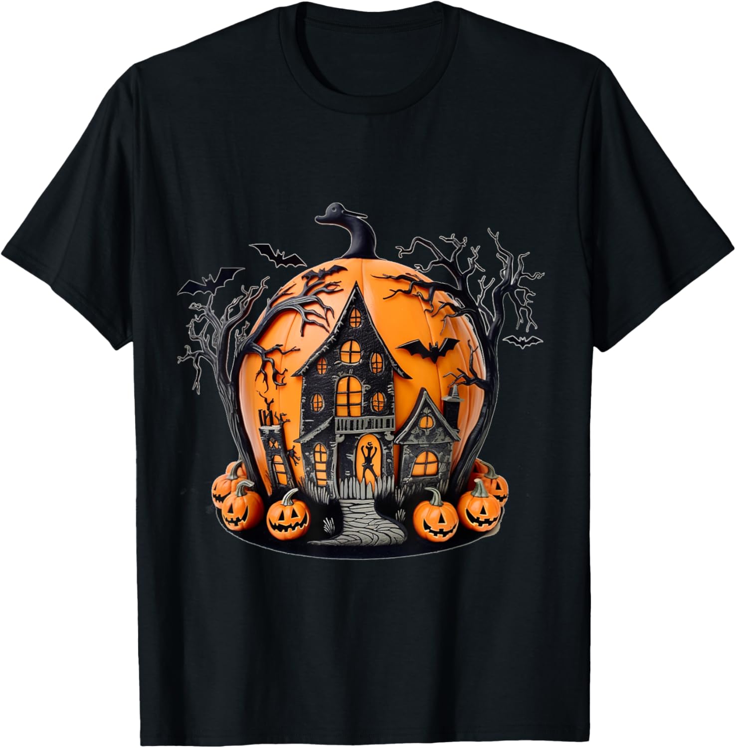 Funny Halloween Design , haunted house, bats, pumpkins T-Shirt