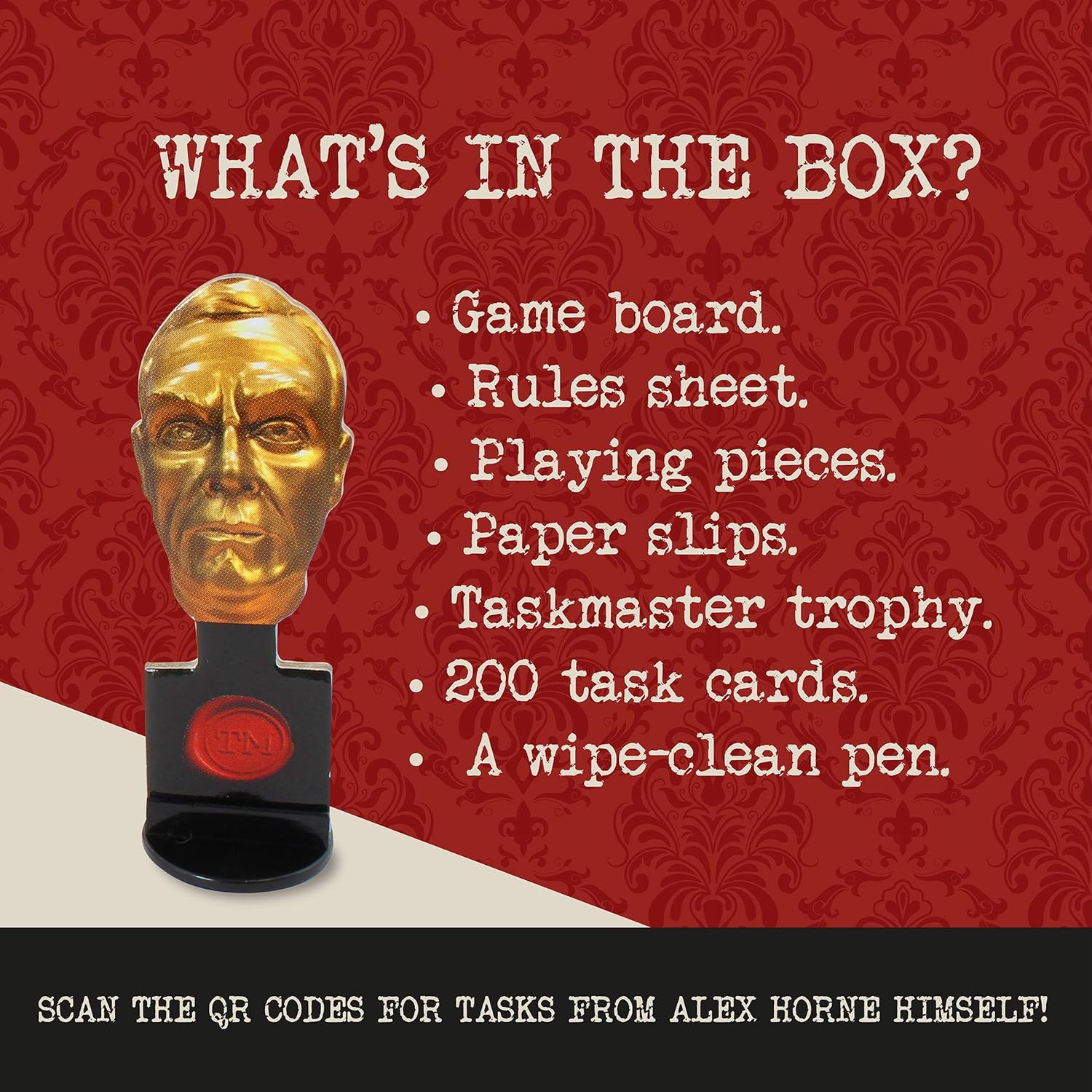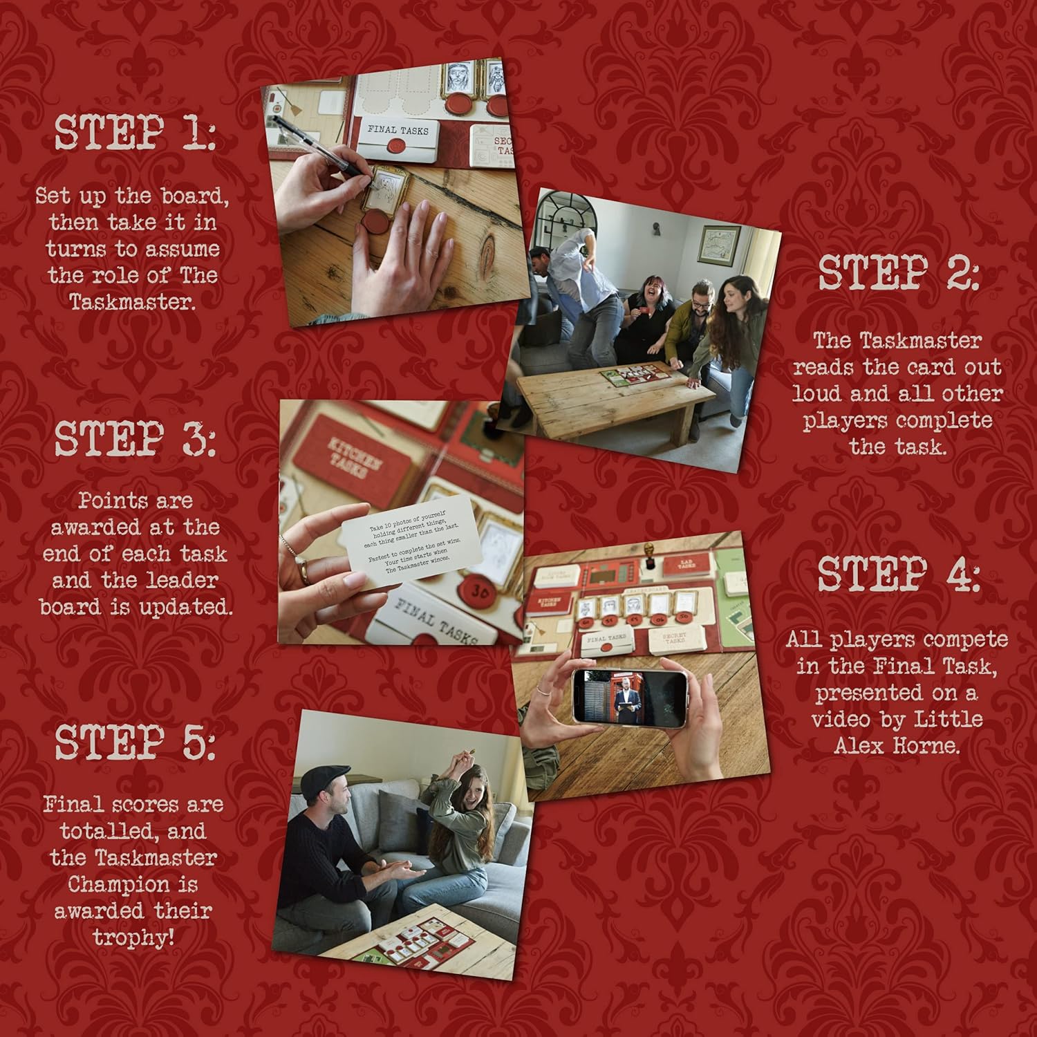 VIDEO TASKS BY ALEX HORNE. Experience the unique twist of video tasks presented by the Taskmaster’s Assistant, Alex Horne. These imaginative video challenges add an interactive element to the game, ensuring you feel part of the TV show every time you play with your friends and family.