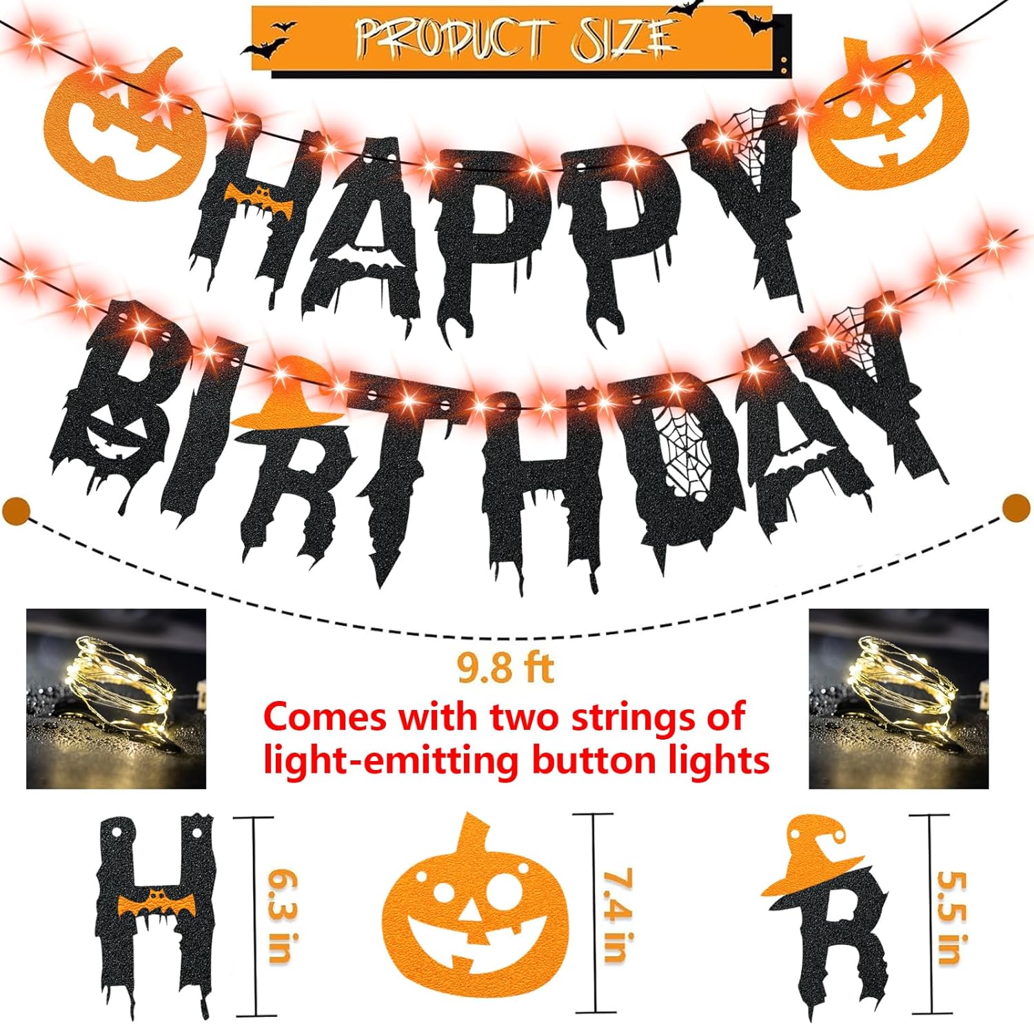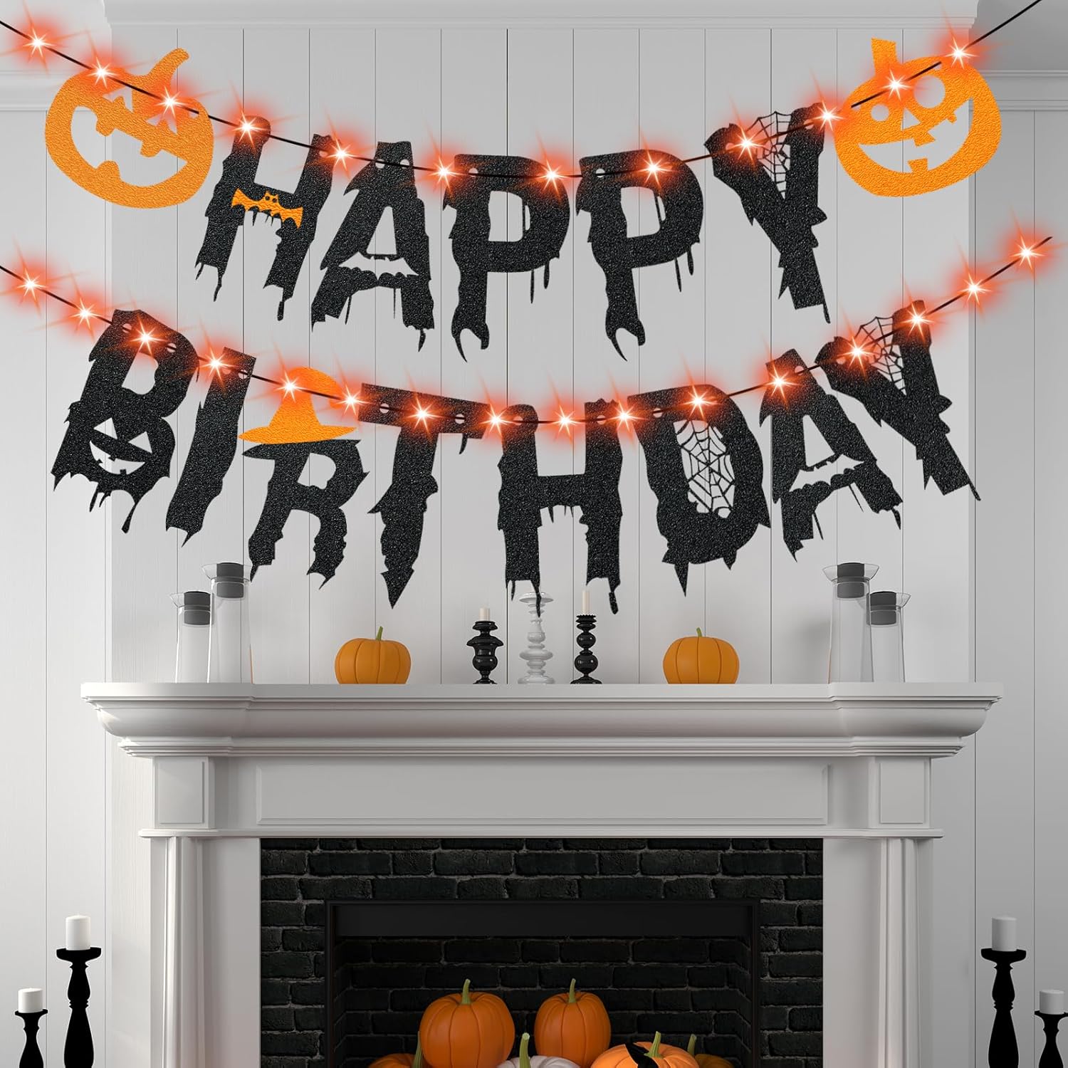 Spooky Halloween Decorations: This “Happy Birthday” banner features a unique Halloween design with glittering pumpkins and witch hat elements, making it an eye-catching addition to your halloween decorations collection.