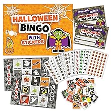 This Halloween-themed Bingo game contains 20x Double-sided bingo cards, 4x Winner certificate cards, 40x Bingo calling cards & 10x High-quality Halloween sticker sheets.