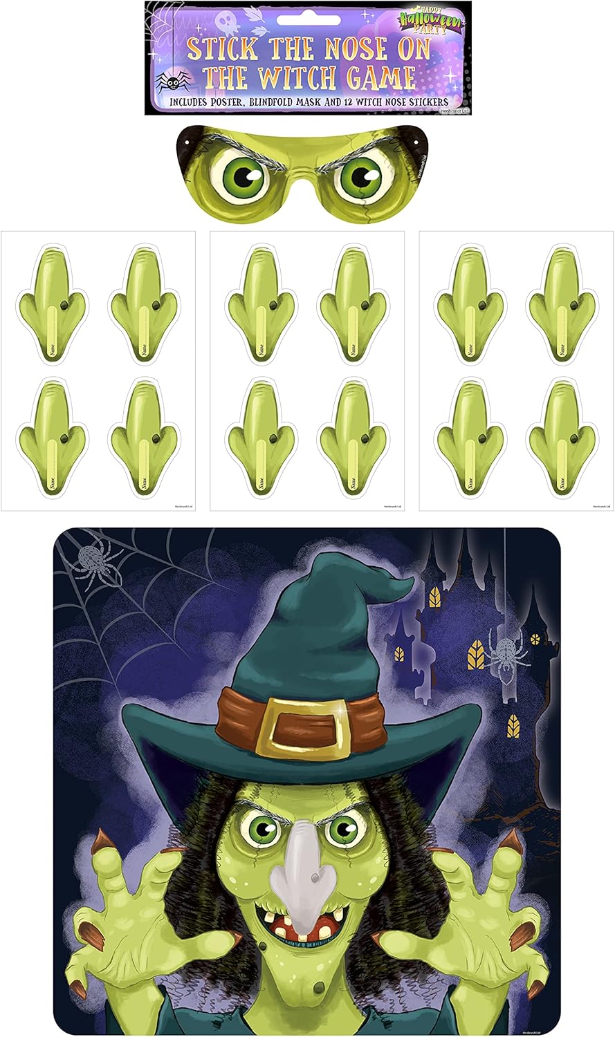 Witch Halloween Party Game For 12 players. Sold: Single. Game includes: 12 x Witch nose stickers. 1 x Blind fold mask. 1 x Poster. 1 x Instructions. Approx size of the game sheet: 41cm x 41cm / 16 in x 16 in Material: Paper Appropriate for children over 3 years old.