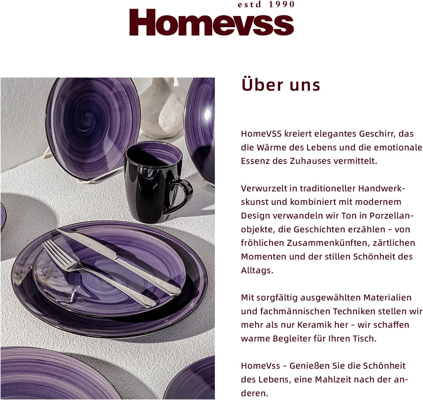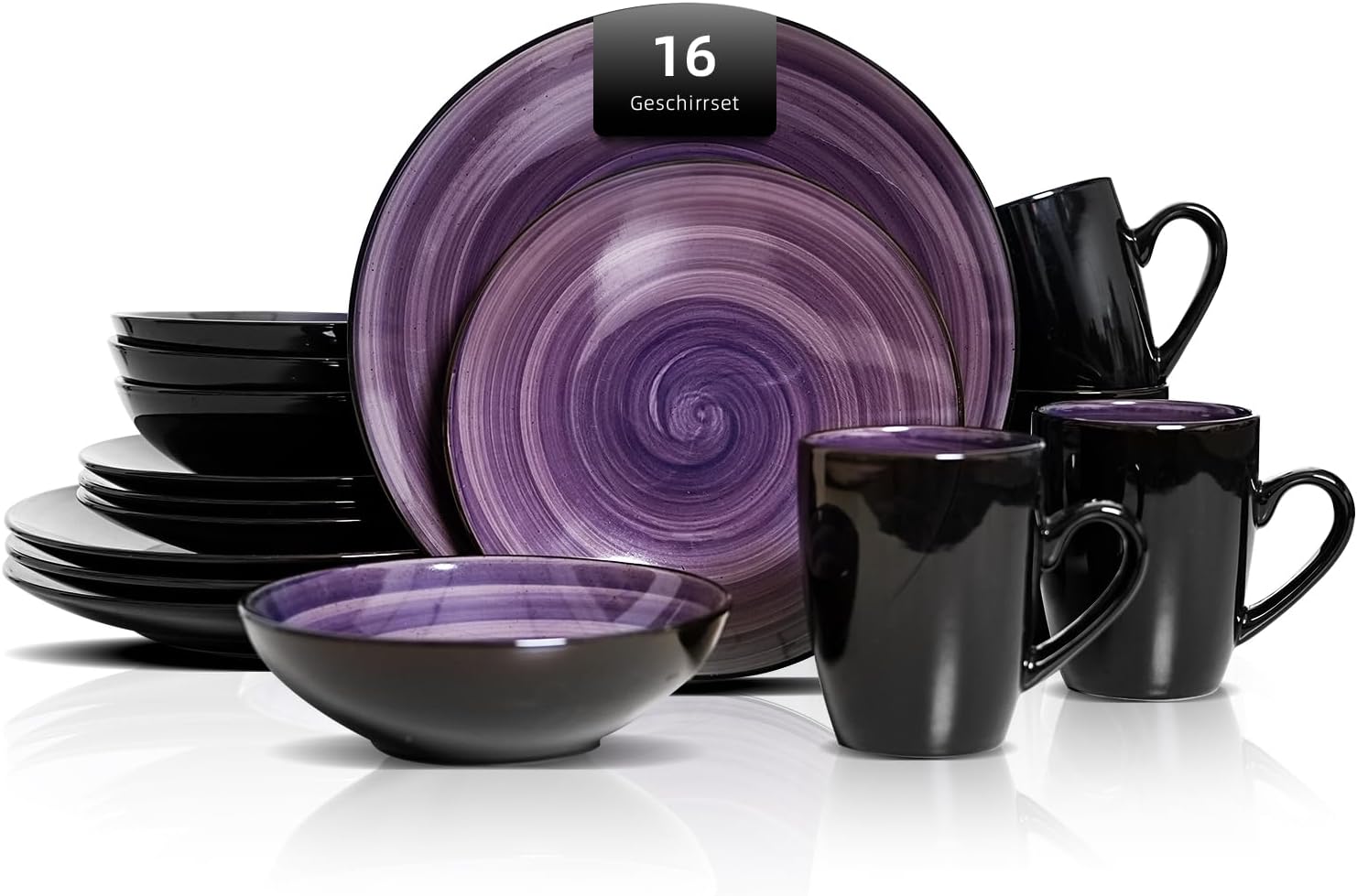 HomeVSS 16 Piece Dinnerware Set Service for 4, Plates and Bowls Set with Mug, Ceramic Dinner Set, Microwave and Dishwasher Safe, Sonoma Collection Dish Set, Hand-Painted Swirl Purple