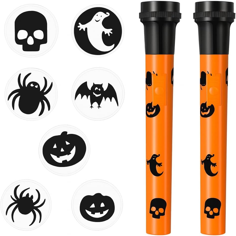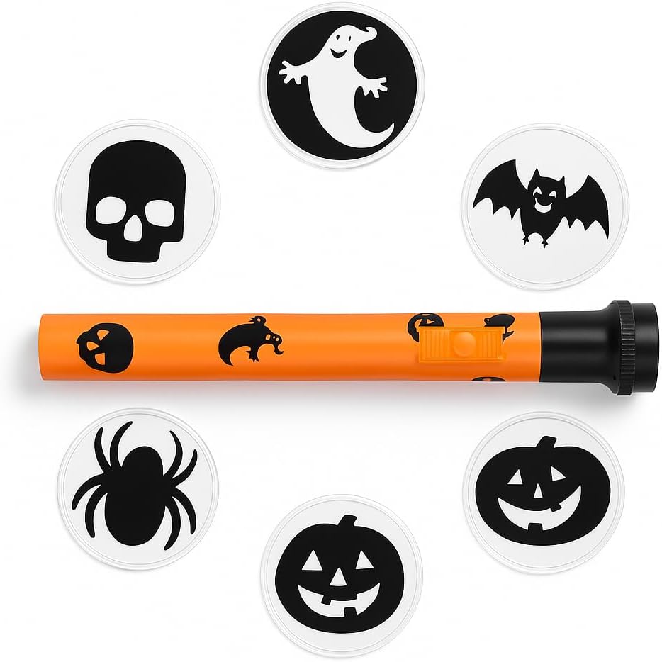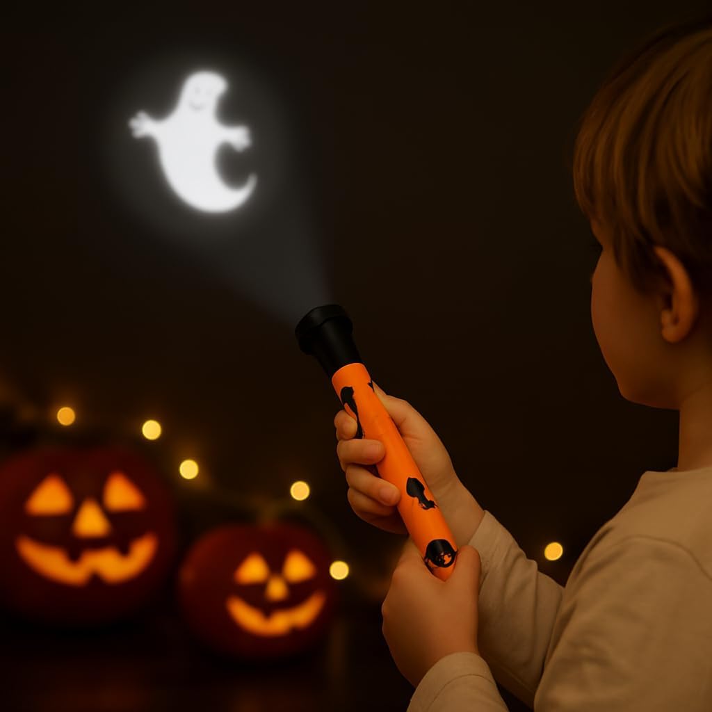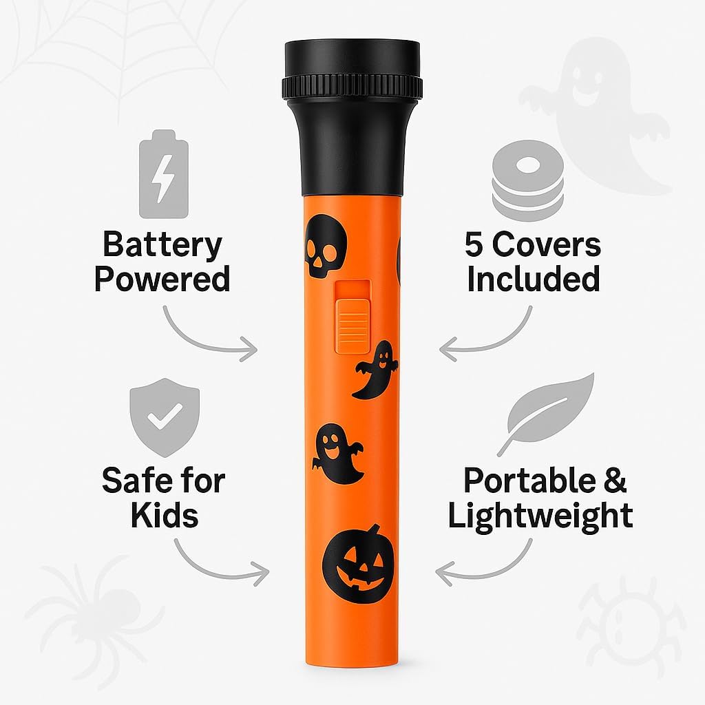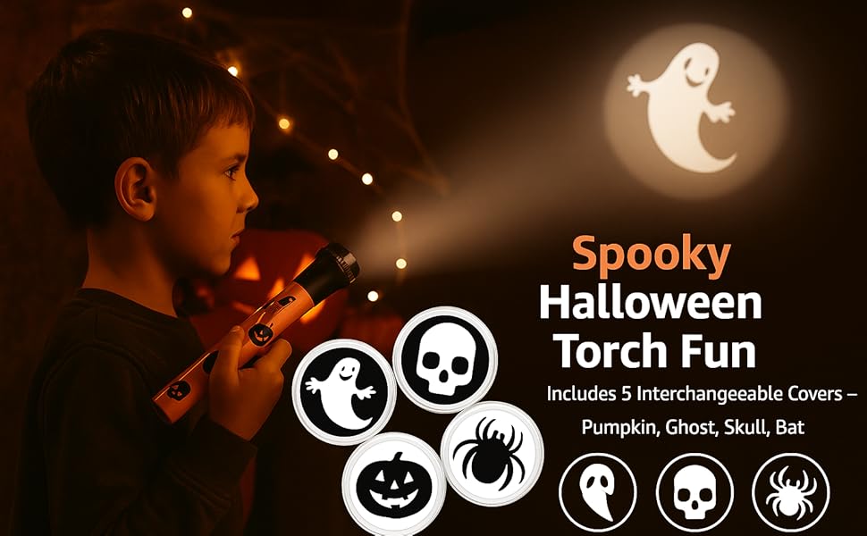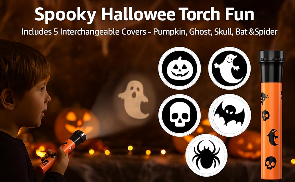 FUN HALLOWEEN PROJECTOR TORCH FOR KIDS – Create a spooky atmosphere with this Halloween torch featuring 5 interchangeable covers (Pumpkin, Ghost, Skull, Bat, Spider). Simply insert a cover, switch on the light, and project fun shapes onto walls, ceilings, or floors for endless entertainment.