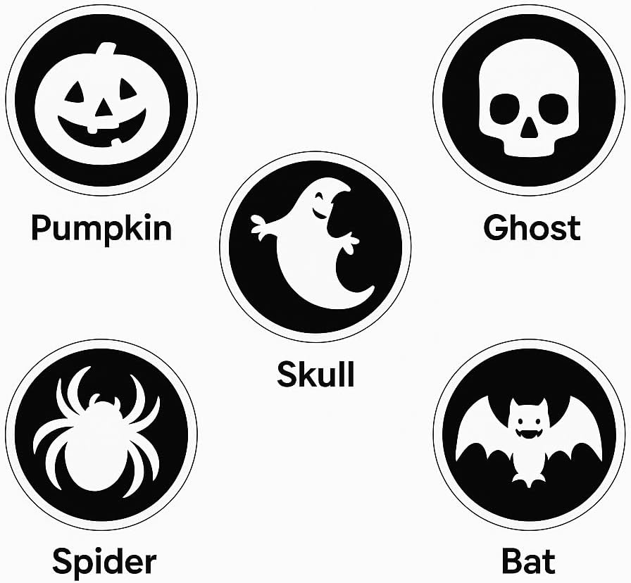 Switch between Pumpkin, Ghost, Skull, Bat, and Spider designs. Easy to clip on and project spooky shapes anywhere.