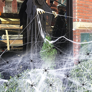 The Halloween Spider Web with 30pcs fake spiders which can cover 300 sqft, the cobwebs is a must-have Halloween party supplies for house, shop, office, bars, haunted house, performance, masquerade, terrified themed party decoration, combined with other Halloween party decorations, they will create creepy and spooky atmosphere for your Halloween party.