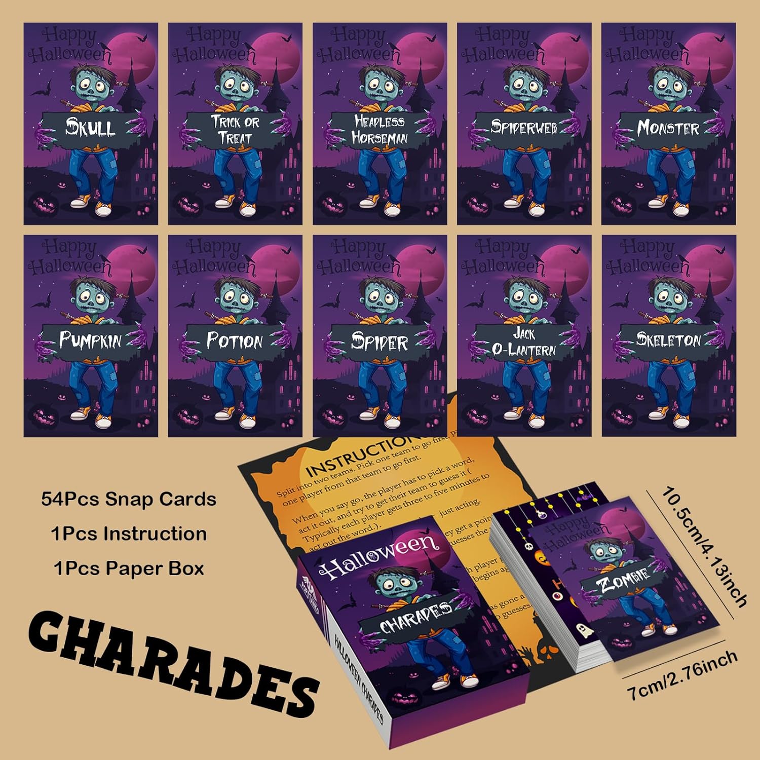 Halloween Charades: Game play is much the same as the traditional charades game with a Halloween Twist, Unlimited Players. Please refer to the instruction manual for specific rules.