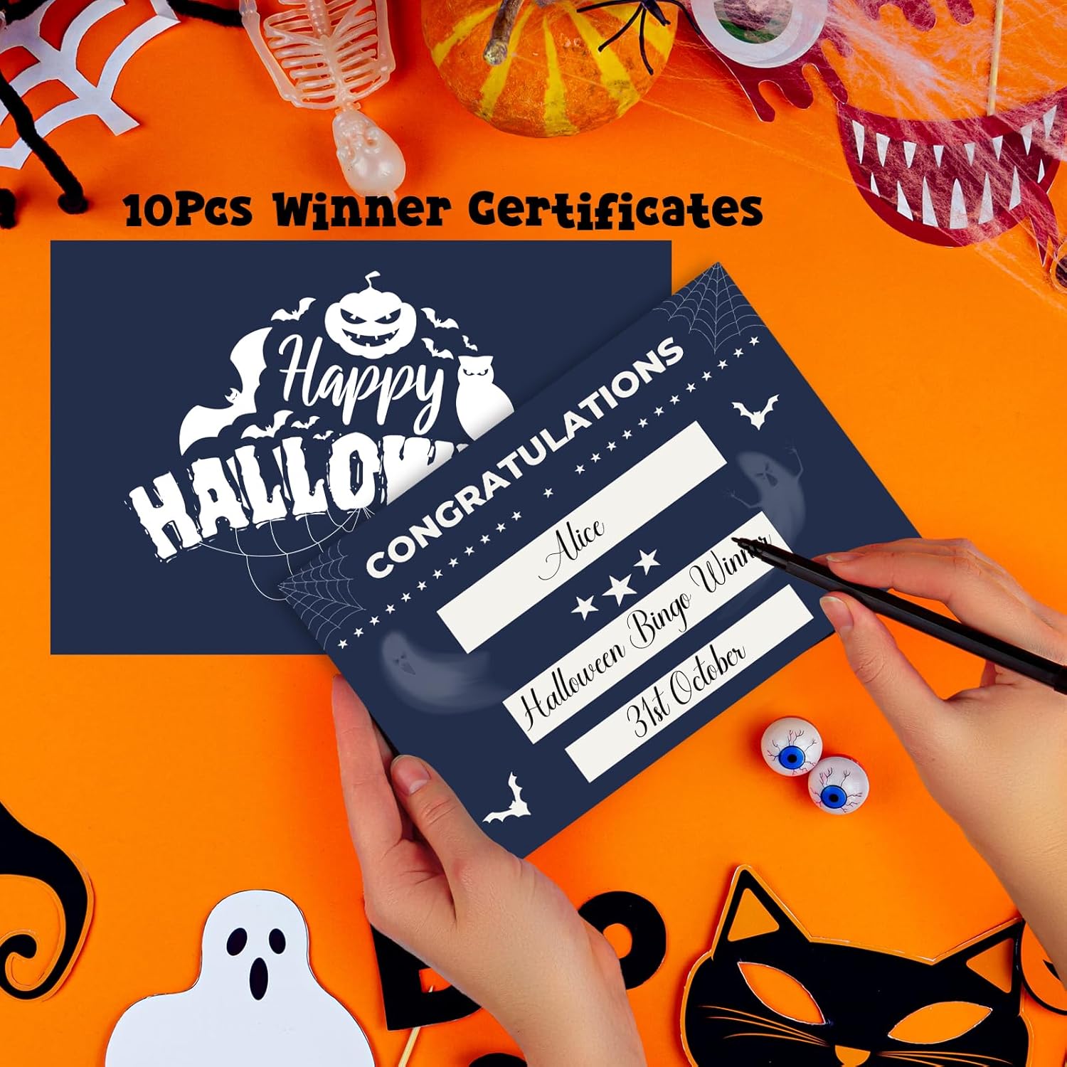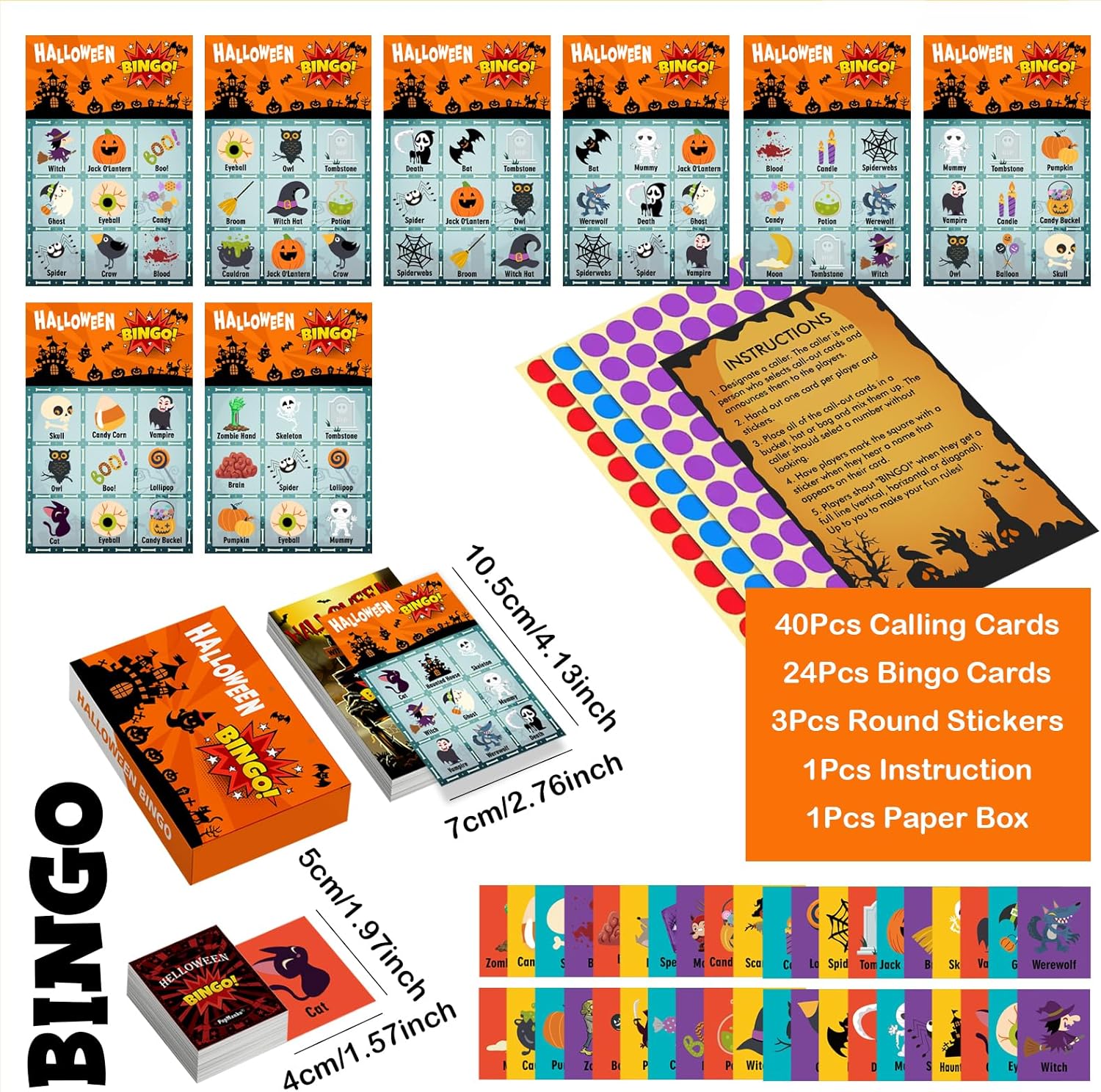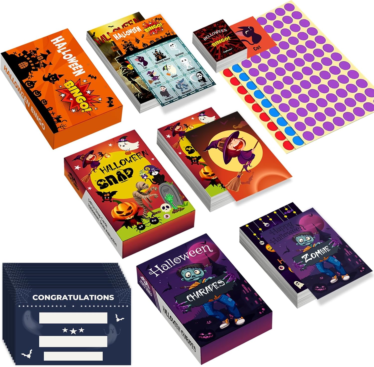 Halloween Party Games Pack: You will recieve 24pcs Halloween bingo cards, 40pcs bingo calling cards, 288pcs round stickers, 54pcs Halloween snap cards, 40pcs Halleween charades cards, 10pcs winner certificates cards. These Halloween Games are sure to keep everyone entertained over the Halloween period.