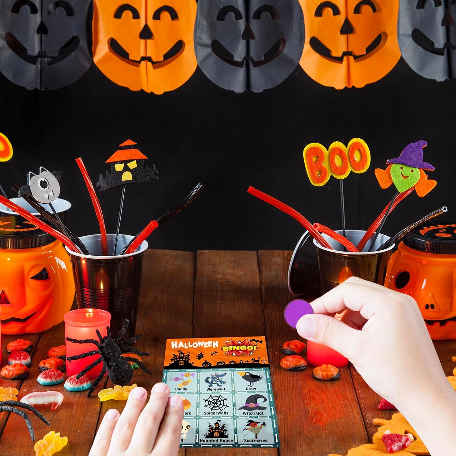 Halloween Bingo: Mark off the Halloween related items on your Bingo Card as the Bingo Caller reads the Halloween related items out aloud at random, up to 24 players. We have prepared stickers and instructions for you.