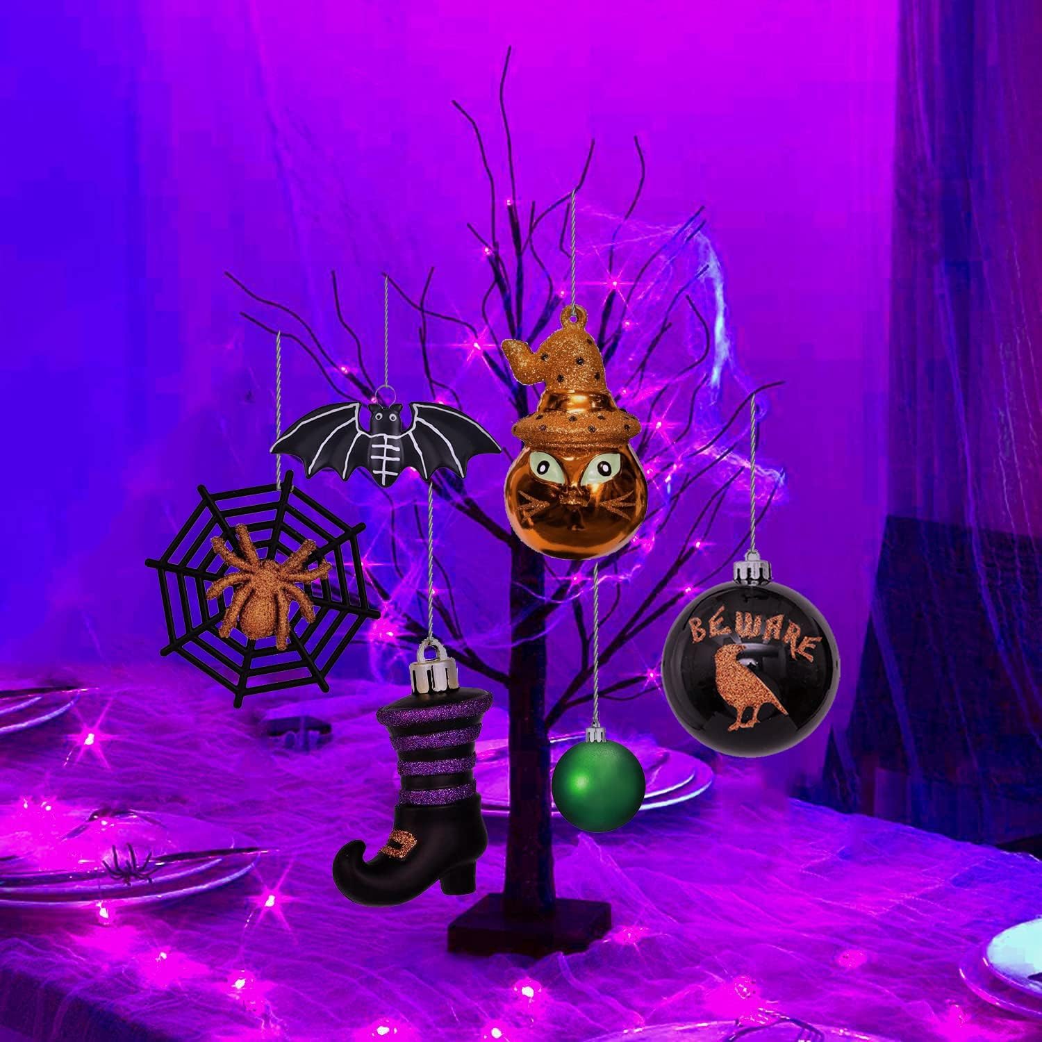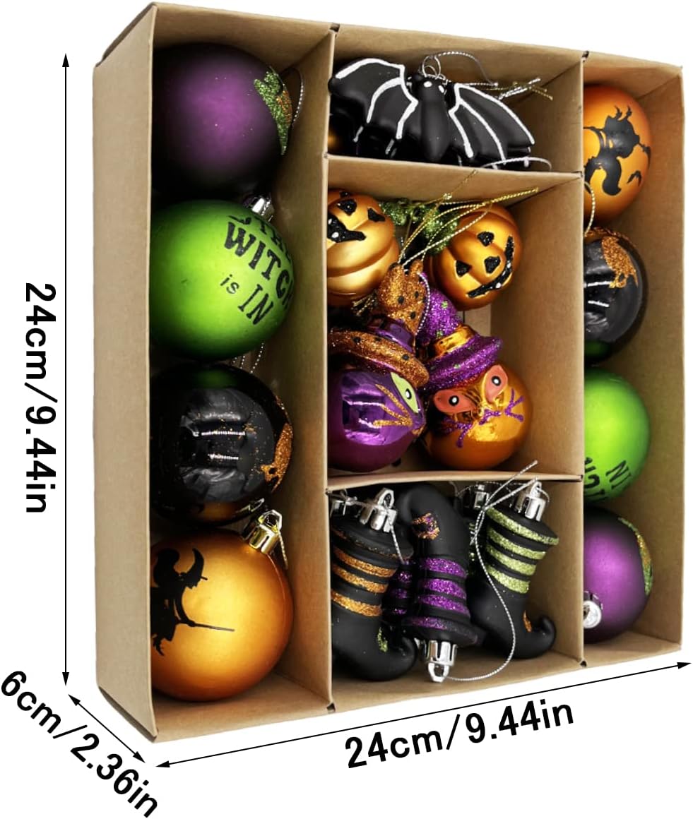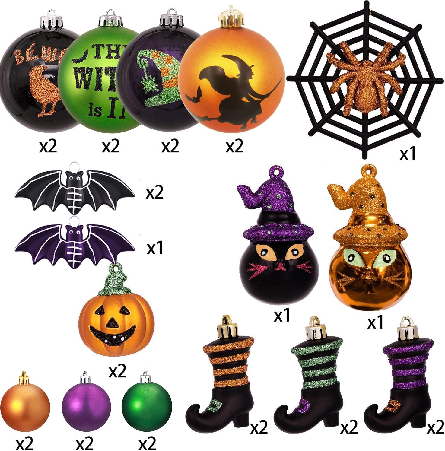 ???Witch Hat Cat Theme Design? The design is inspired by the spoof white and black Halloween style. Classic black and orange is the most traditional theme of Halloween, pumpkins, bat and spider to create a happy halloween atmosphere. Trick or Treat Funny Horror Combination, let’s have a happy halloween. Note: Some Halloween decorations apply sticky powder craft, powder falling off is normal, but the powder is easy to clean up. ???Exquisite Craftsmanship?Halloween Baubles Ornaments includes special finishes: shiny, matt, glitter. Each Halloween ball is blow-molded and then hand-painted. Multi-finish and novelty shape Baubles ornaments meet all of your favorite tree decoration. ???Premium Quality?Each bauble is pre-tied with cap and rope (Spare strings included). These are made of durable plastic to provide excellent shatterproof ornaments. Ideal for families with kids and pets. The perfect decoration for this years big Halloween party ???Application? This Halloween ornaments set of 28 pcs, include many kinds of shape, as, witchs, bats, witch boots, spider, pumpkins etc. Perfect for DIY tabletop decorating and enriching your Halloween tree, tabletop decoration and DIY for wreaths, garlands or door decor. It can perfectly create a festive atmosphere in your interior and also makes an excellent gift.