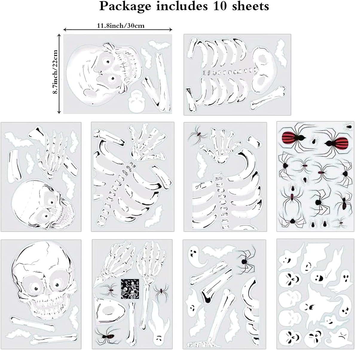 【Halloween decoration】:There will be 10 sheets window stickers,skeleton,ghost,spider and bats.The cute shape is the best ideal to get children involved in decoration.