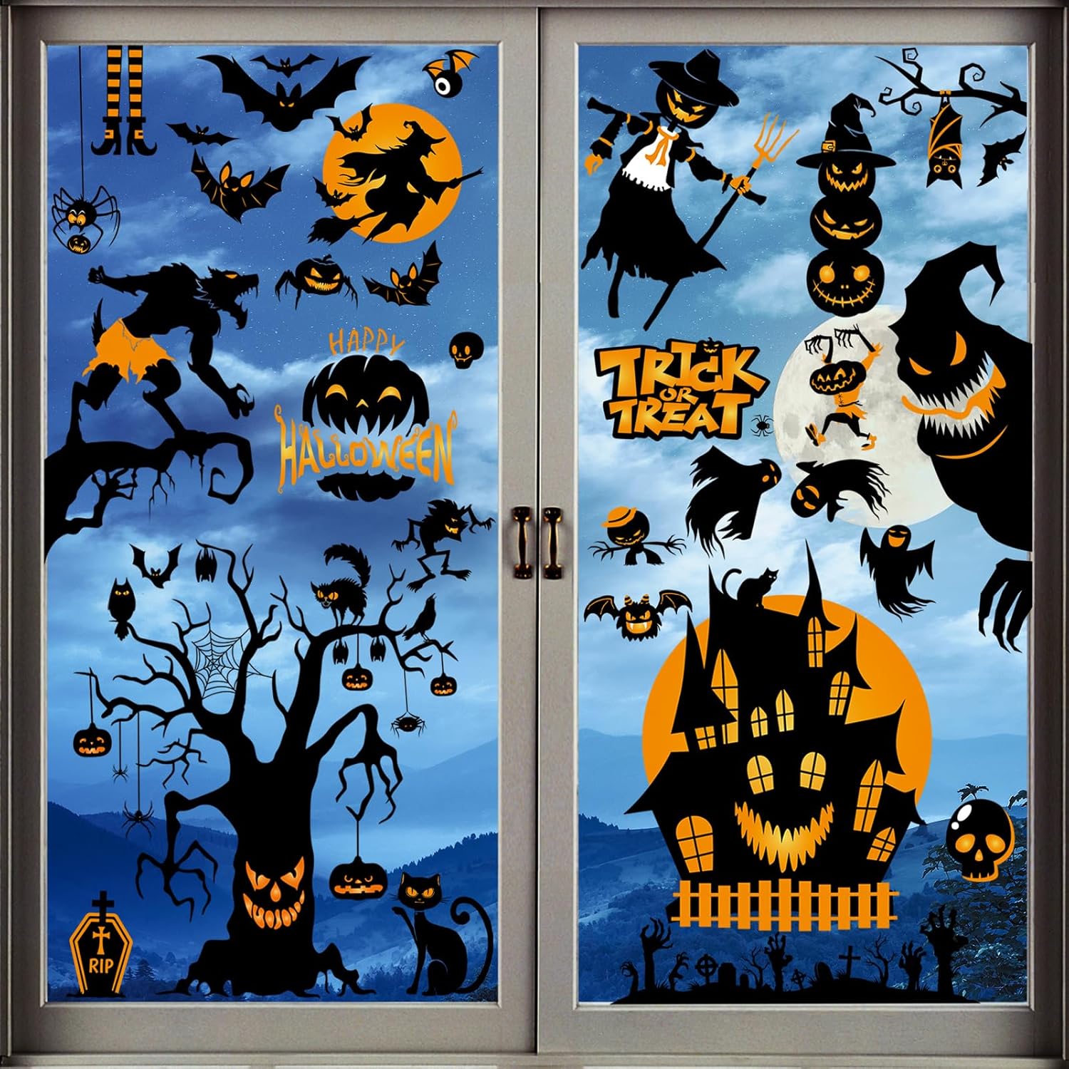 【Creepy Halloween Window Stickers】For a spooky and inviting Halloween atmosphere, our Halloween window clings are a perfect choice. These halloween decorations window clings feature creepy ghouls, haunted houses, twisted tree monsters, eerie scarecrows, werewolves, spiders, monsters, witches, cats, bats, and pumpkin Halloween decorations.