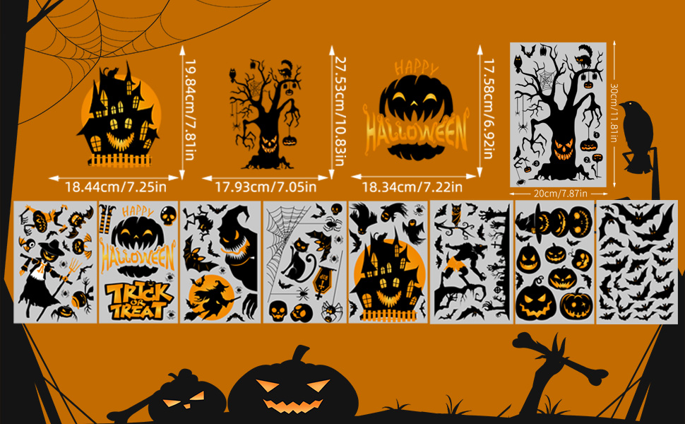 【Valuable Halloween Window Clings】The halloween sticker window decorations have 9sheets Halloween window clings with a total of 98 pieces, each measuring 20cm/7.87in x 30cm/11.7in. These Halloween stickers are enough and perfect for windows decorations or mirrors.