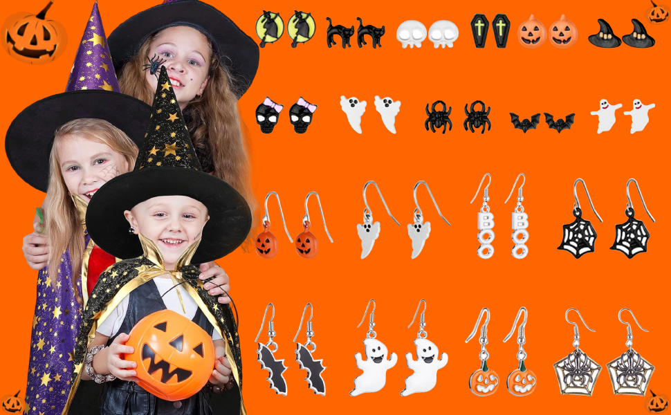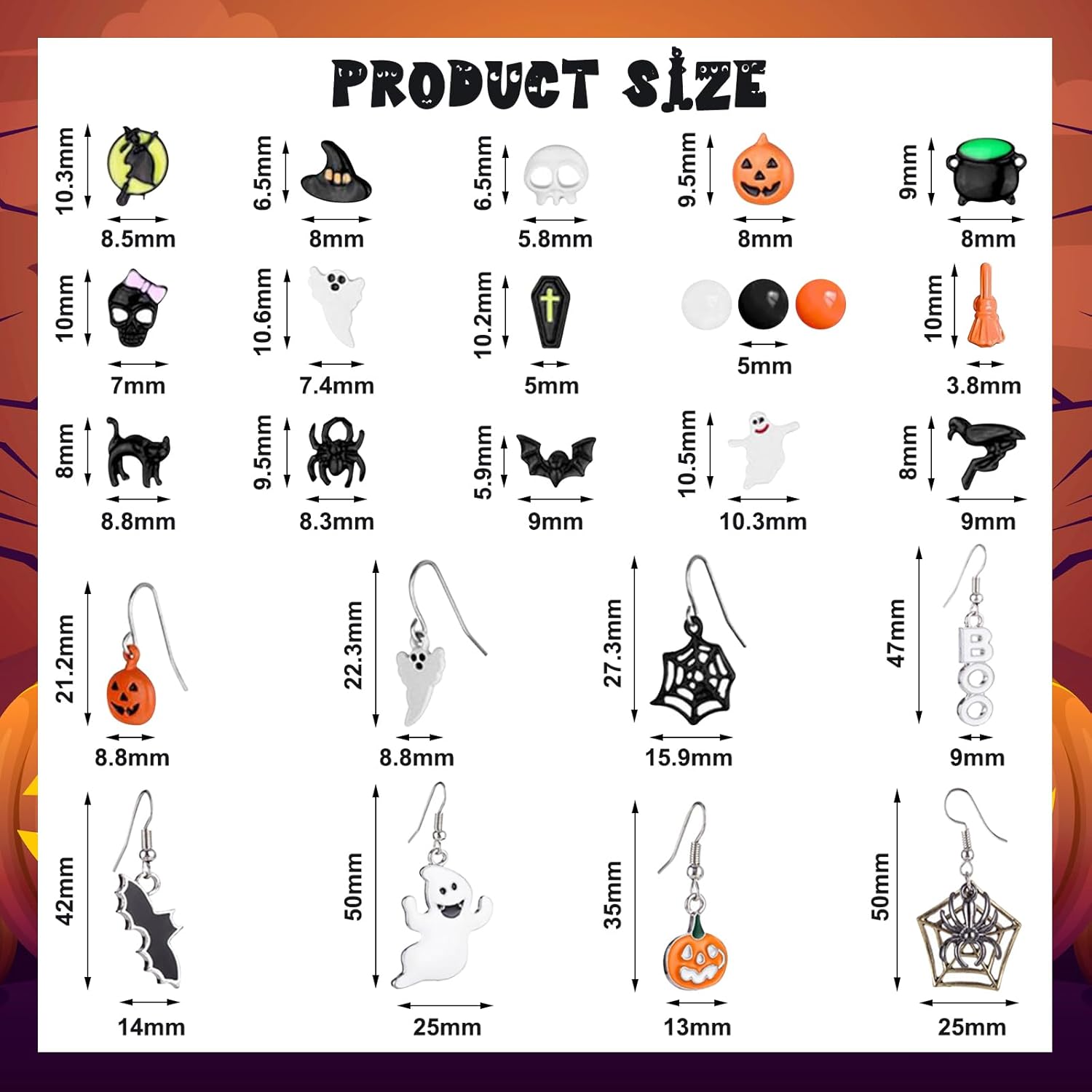 This halloween earrings studs has 25 styles, with rich Halloween elements and exquisite patterns, including pumpkins, black cats, ghosts, skulls and other elements, using the classic Halloween color matching of yellow and black. It adds a mysterious atmosphere of Halloween.